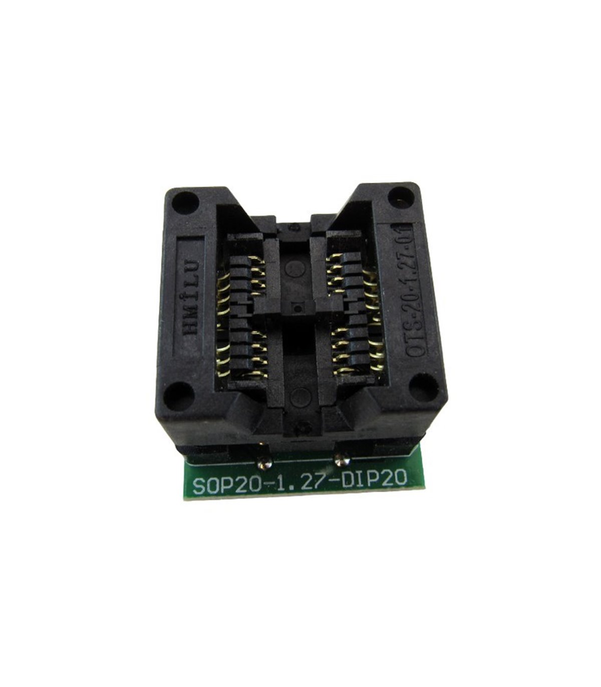 Адаптер ZIF для программирования OTS20 1.27mm SOP20 to DIP20.ОсобенностиДля установки/изъятия микросхемы, следует нажать на верхнюю часть корпуса. При этом, подпружиненные контакты расходятся, освобождая микросхему для безопасной замены.Технология ZIF (Zero Insertion Force) - отсутствие усилия на контакты при установке/изъятии микросхемы из панелькиТехнические параметрыZIF SOIC панель OTS-20-1.27-01 с качественными контактами из фосфористой бронзыШаг выводов: 1.27ммШирина корпуса SOIC: 200mil (5.08 мм, среднее)Стандартные контакты DIP - (PLS4 в 2 ряда), шаг выводов 2.54 мм, для установки в DIP панель программатора