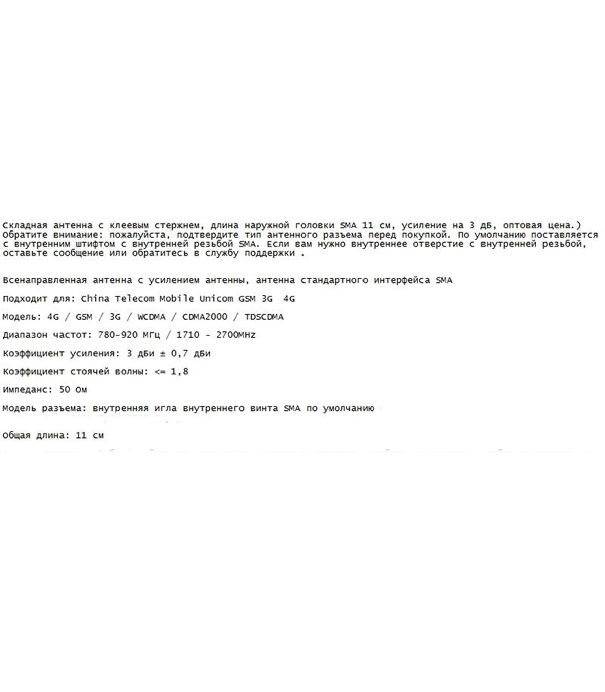 Внешняя антенна LTE GSM 4G GPRS 868MHz 3dBi. Подходит для всех устройств Модель: 4G / GSM / 3G / WCDMA / CDMA2000 / TDSCDMA Диапазон частот: 780-920 МГц / 1710 - 2700MHz Коэффициент усиления: 3 дБи ± 0,7 дБи Коэффициент стоячей волны <,= 1,8 Импеданс: 50 Ом Модель разъема: SMA Общая длина: 11 см