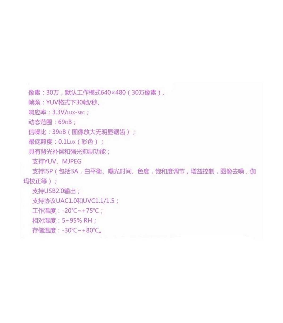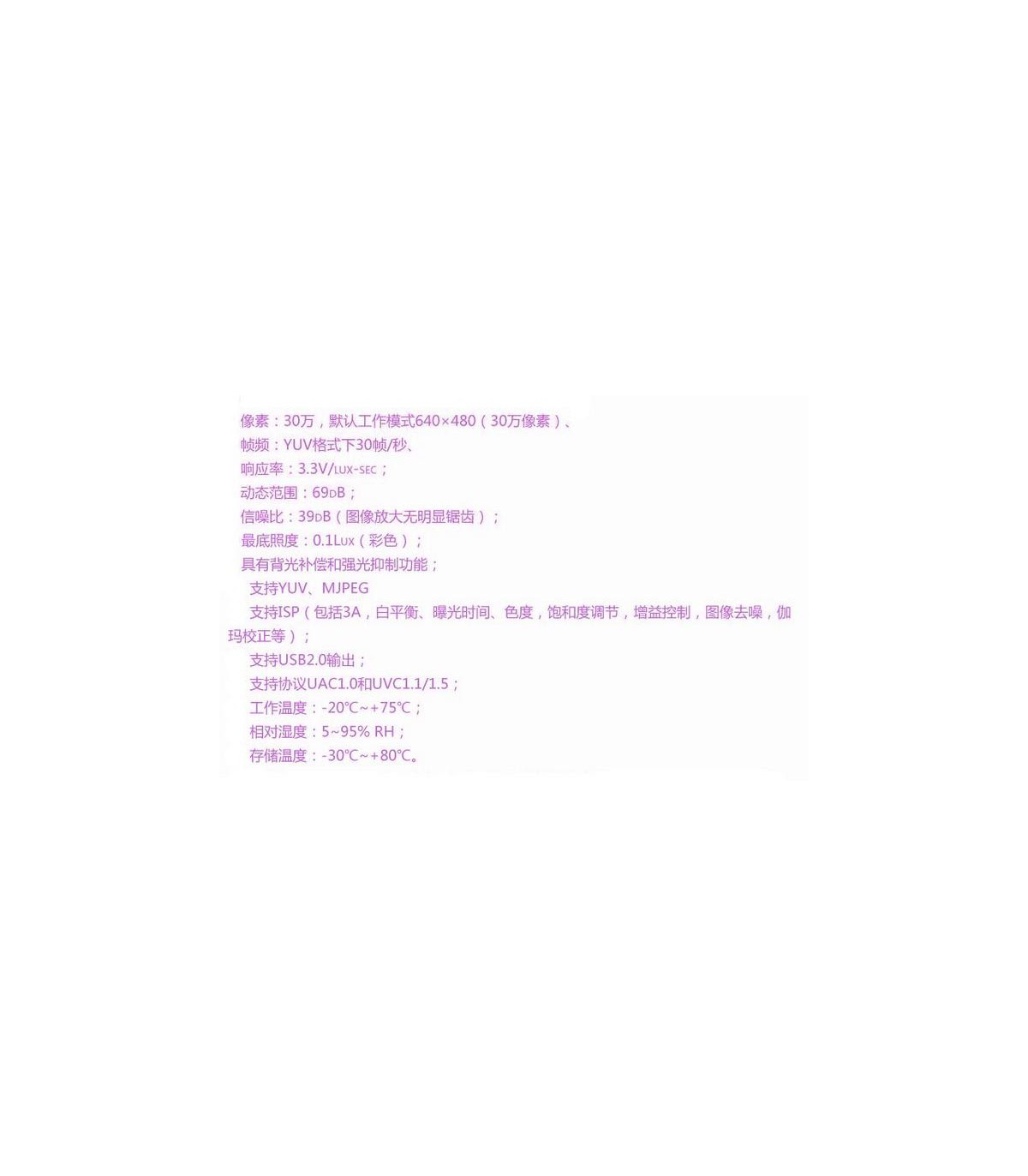 Размер: 300 000 пикселей Рабочий режим: 640x480 Поддержка: YUV, MUPEG, ISP Протокол поддержки: US82.0 UACIOUVCL1 / 15 Рабочая температура: -20 ° C- + 75'C ERV 5-95% RH 30'C- + 80C