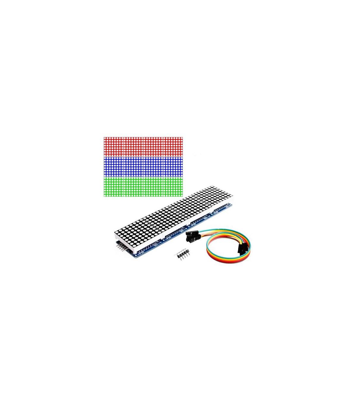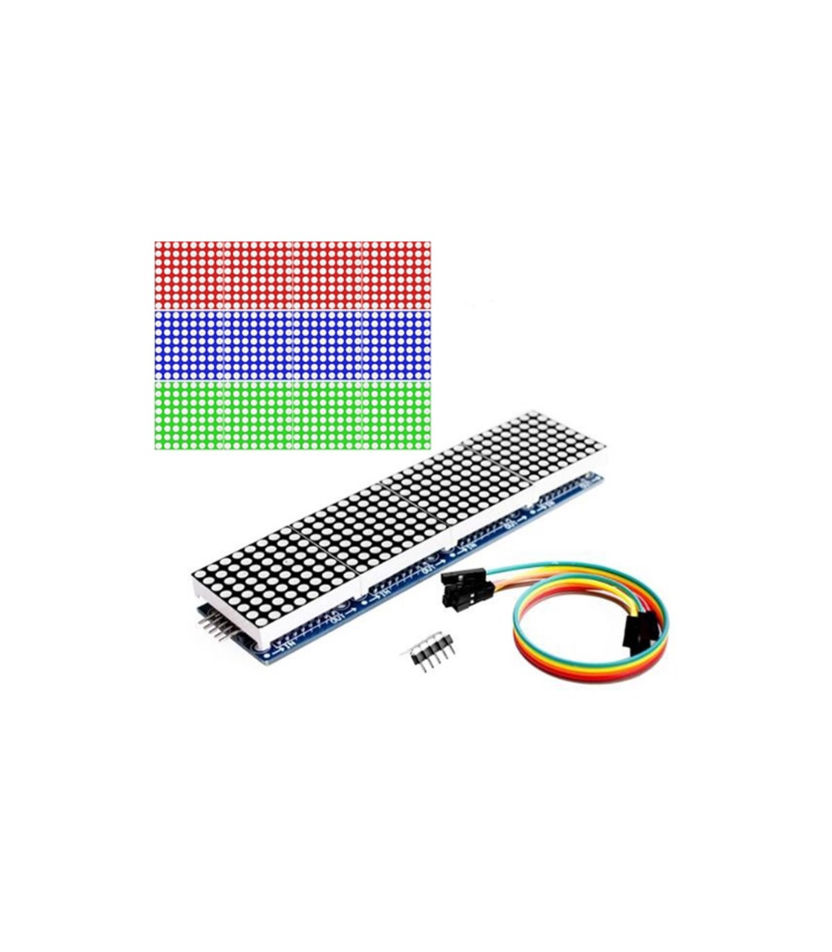 Модуль объединяет на одной плате сразу четыре светодиодных матрицы 1088AS с драйверами MAX7219 в SMD корпусе. Для управления светодиодными матрицами используется интерфейс SPI, то есть используется всего лишь три линии данных. Несколько таких модулей можно включить последовательно, причем так как размеры платы соответствуют размерам матрицы, то модули можно объединять в двухмерные панели. Характеристики: Количество точек - 256 (32х8) Напряжение питания - 5 В Интерфейс - SPI Тип матрицы - общий катод Диаметр точки - 3.7 мм Цвет свечения - красный Количество выводов с платы - 5 Размеры - 128 x 32 x 15 мм Комплектация: 1x Модуль на четыре матрицы 1088AS с драйверами MAX7219 (SMD версия), распаянный 2x PLS разъем 5-пиновый 1х шлейф на 5 проводов 'мама-мама'