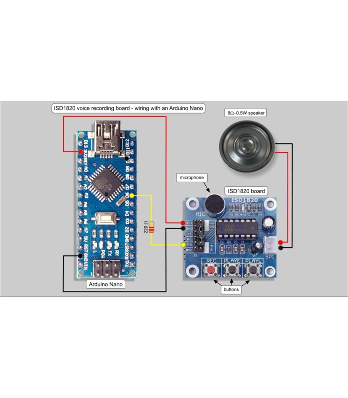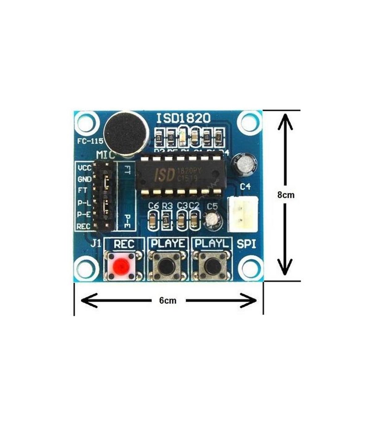 Хранения данных во встроенной флэш-памяти, до 100 лет и количеством циклов 100.000 стирания / записи. Время для записи / воспроизведения одного сообщения 8-20 секунд. Напряжение питания: DC 2.4-5.5V. С встроенным звуковым усилителем, эта микросхема может управлять динамиком напрямую (рекомендовано 8 Ом 0,5 Вт ). Предусмотрены входные цепи, для подключение микрофона. Может управляться микроконтроллером.