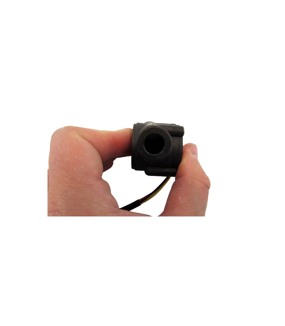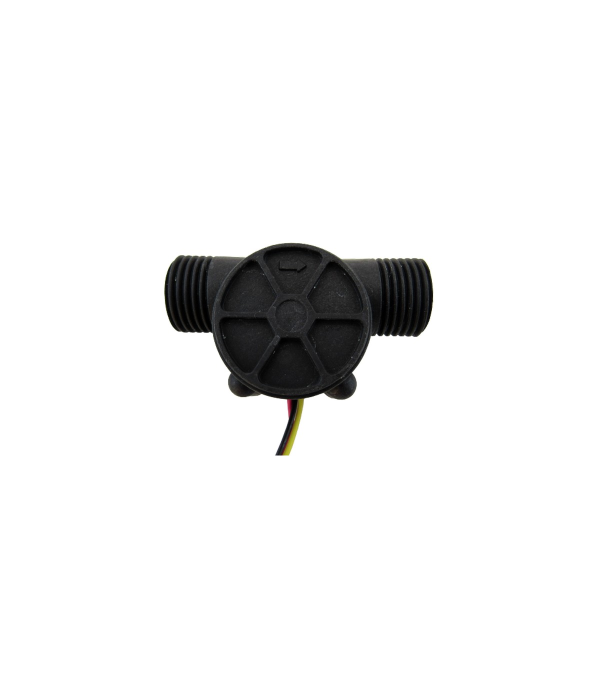 Датчик потока воды состоит из пластикового клапана с двумя штуцерами с резьбой ½ дюйма, водного ротора и датчика Холла. Когда вода проходит сквозь датчик, ротор вращается со скоростью пропорциональной скорости потока воды. Датчик Холла фиксирует каждый оборот и передает полученный сигнал.
