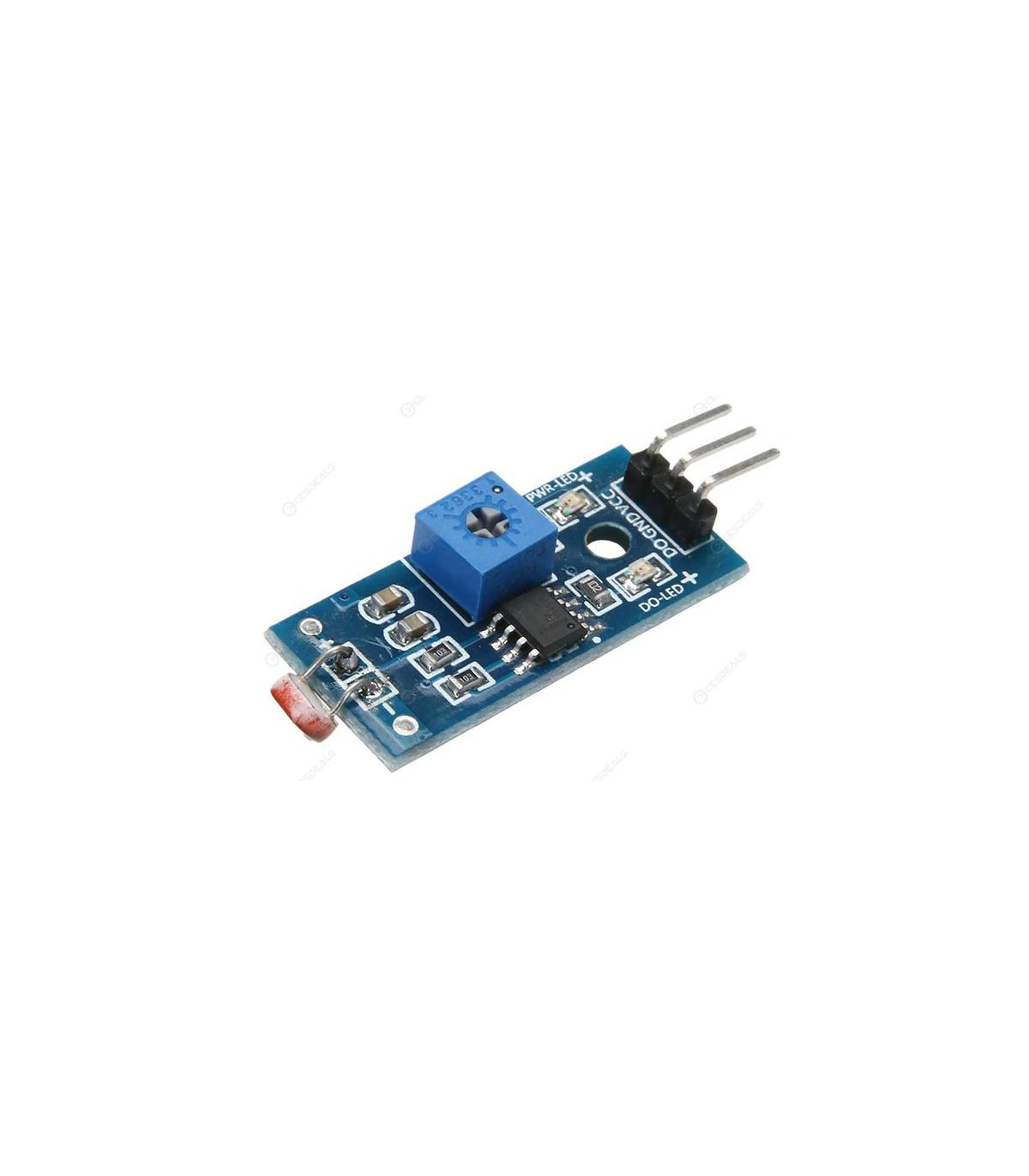 Цифровой датчик освещенности со встроенным фоторезистором, изменяющим свое сопротивление от яркости света падающего на него. Таким образом, датчик может реагировать на изменение света, и давать сигнал, к примеру, на включение или выключение устройства: фонаря, реле, насос и т.п. Технические характеристики Рабочее напряжение: от 3 до 5 Вольт DC Выходной сигнал: аналоговый или цифровой Наличие потенциометра настройки чувствительности