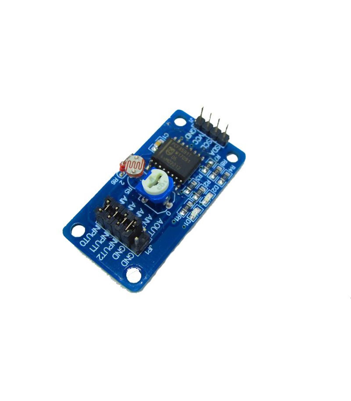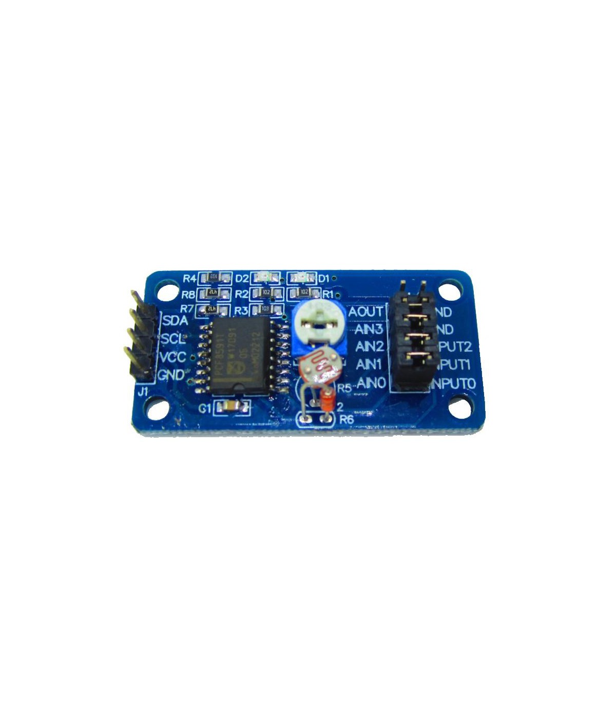 ЦАП АЦП PCF8591 модуль с датчиками 8 бит. Конвертер построенный на базе микросхемы PCF8591, имеет 4 аналоговых входа (АЦП, он же ADC), 1 аналоговый выход (ЦАП, он же DAC), разрешение каждого входа/выхода 8 бит. Управляется по шине I2C с помощью Ардуино, Raspberry Pi или другого контроллера поддерживающего этот протокол. Рабочее напряжение 2.5 - 6В. Можно использовать, если не хватает аналоговых входов/выходов на микроконтроллере - вешаем платку на шину I2C (она же IIC или TWI) и получаем данные с датчиков. Если сравнивать с АЦП Ардуино, то данный модуль проигрывает по разрешению (у Ардуиновского АЦП 10-битное разрешение), зато можно сравнивать не просто поступающее напряжение как в Ардуино (от 0 и до 5В), а сравнивать между собой напряжения из разных источников (например для контроля уровня батарей), когда на один вход подается напряжение с одного источника, на второй - с другого и сравниваем результат. Так же, можно замерить напряжение на всех 4 входах одновременно и затем получить 4 байта со значением по каждому входу (Ардуино так тоже не умеет). Так же на плате расположены потенциометр (подстроечный резистор), термистор (датчик температуры) и фоторезистор (датчик освещенности), которые подключены к аналоговым входам с помощью перемычек. С ними можно поэкспериментировать для знакомства с платой, а потом снять перемычки и подать на входы другие источники. Джампер P4 подключает вход AIN1 к термистору, джампер P5 подключает вход AIN0 к фоторезистору, а джампер P6 подключает вход AIN3 к потенциометру 10 кОм. Так же на плате есть два светодиода - красный для индикации питания, зеленый для индикации сигнала на аналоговом выходе AOUT (чем ярче горит, тем выше напряжение на выходе).