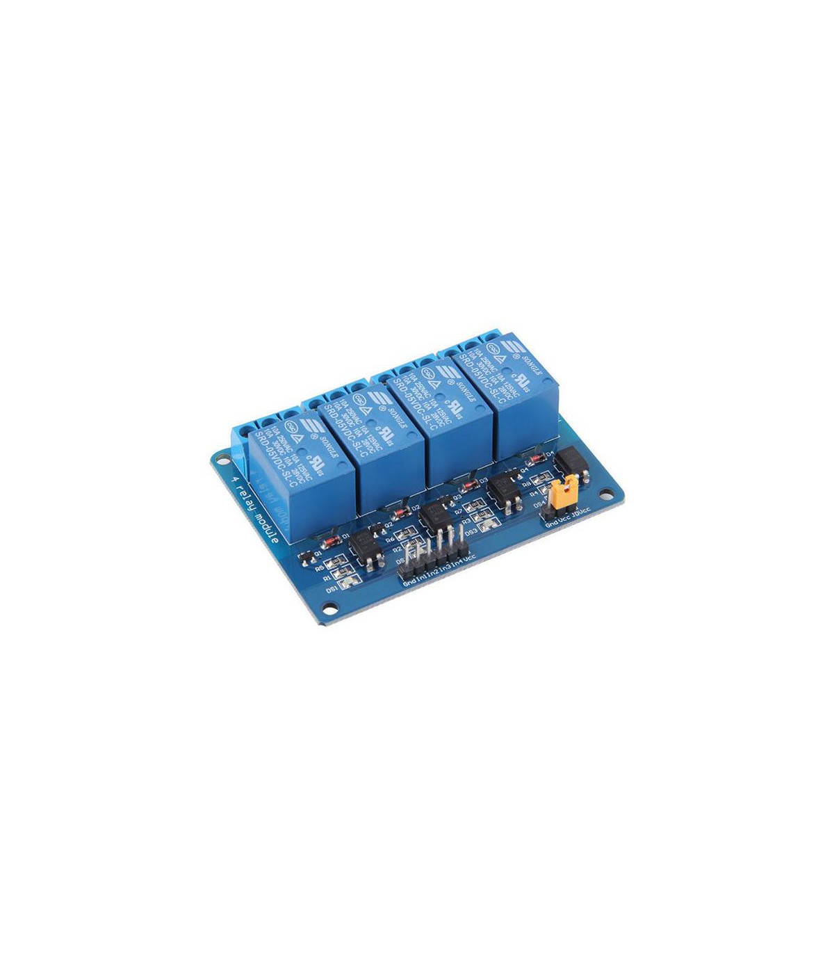 Управление модулем осуществляется с помощью микроконтроллера, компьютера или другого микропроцессорного управляющего устройства. На плате релейного модуля есть джампер для переключения между Gnd-Vcc и Vcc-JDVcc (5В Arduino и 5В источника питания).