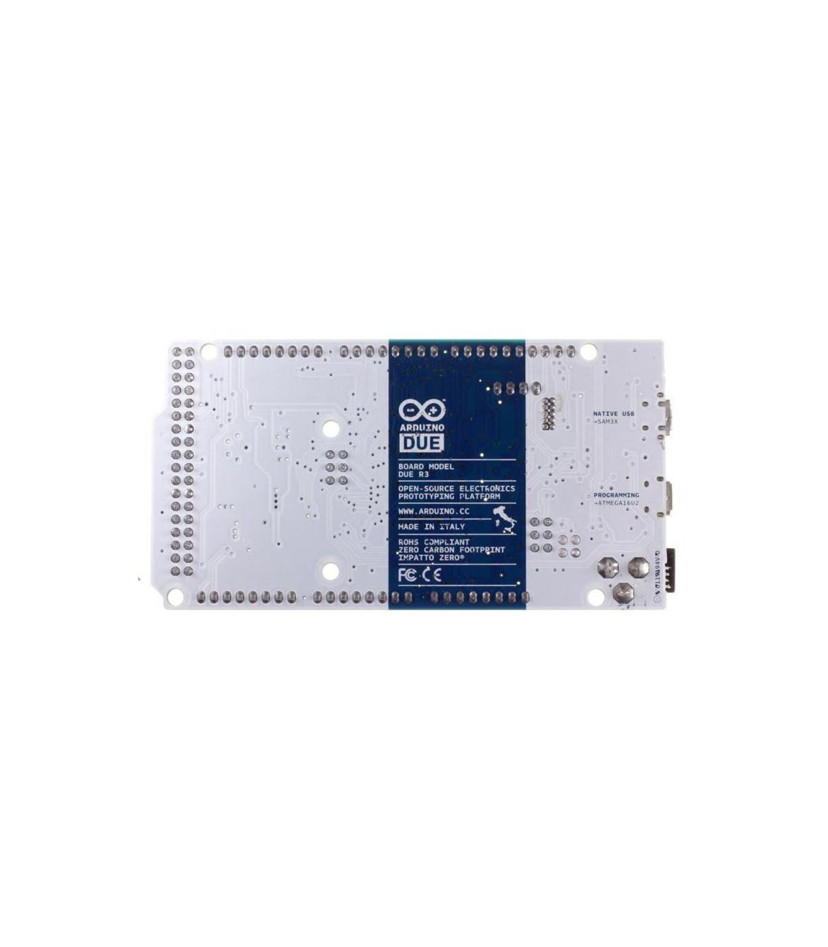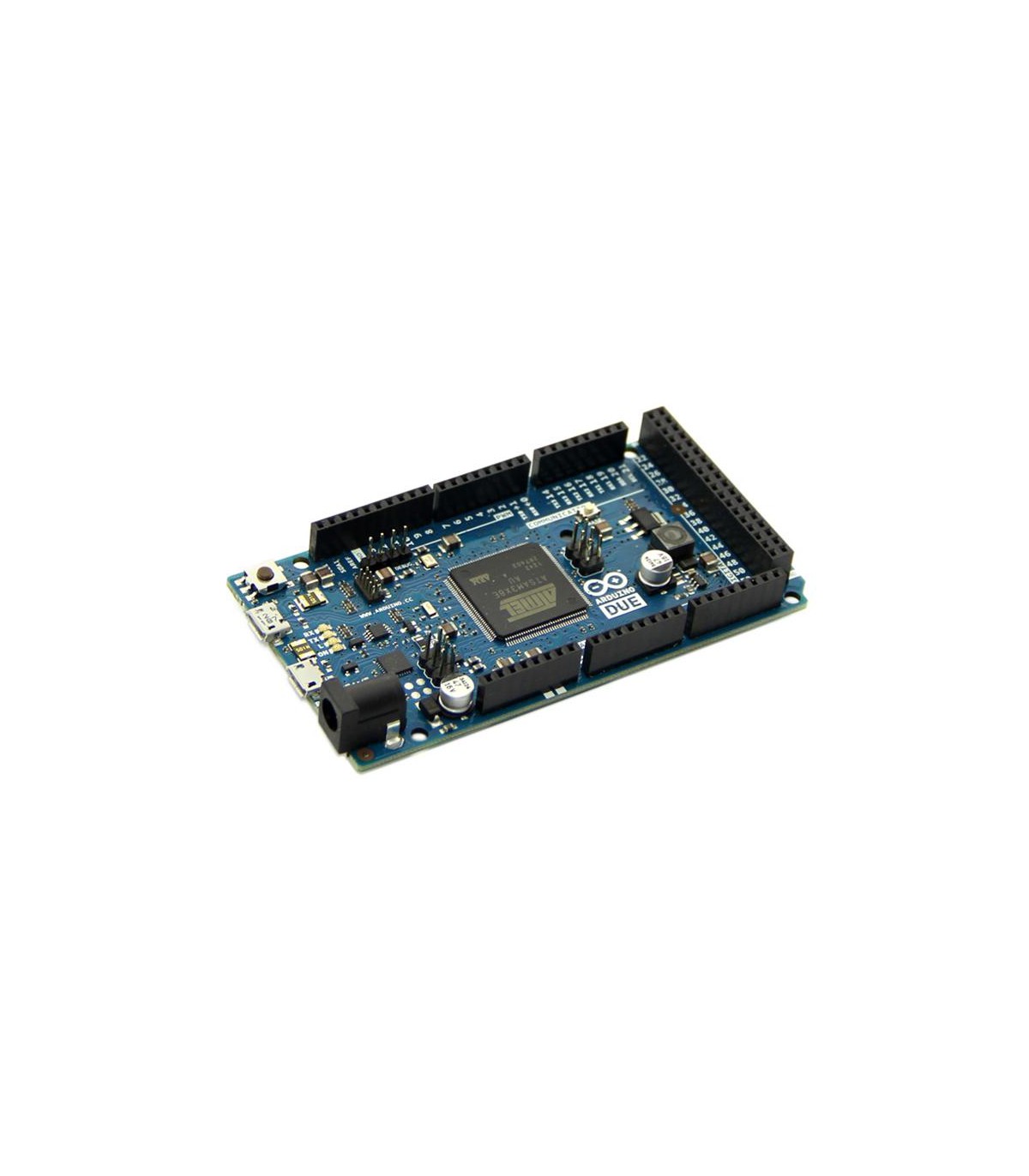 Arduino Due — плата микроконтроллера на базе процессора Atmel SAM3X8E ARM Cortex-M3 (описание). Это первая плата Arduino на основе 32-битного микроконтроллера с ARM ядром. На ней имеется 54 цифровых вход/выхода (из них 12 можно задействовать под выходы ШИМ), 12 аналоговых входов, 4 UARTа (аппаратных последовательных порта), a генератор тактовой частоты 84 МГц, связь по USB с поддержкой OTG, 2 ЦАП (цифро-аналоговых преобразователя), 2 TWI, разъем питания, разъем SPI, разъем JTAG, кнопка сброса и кнопка стирания.