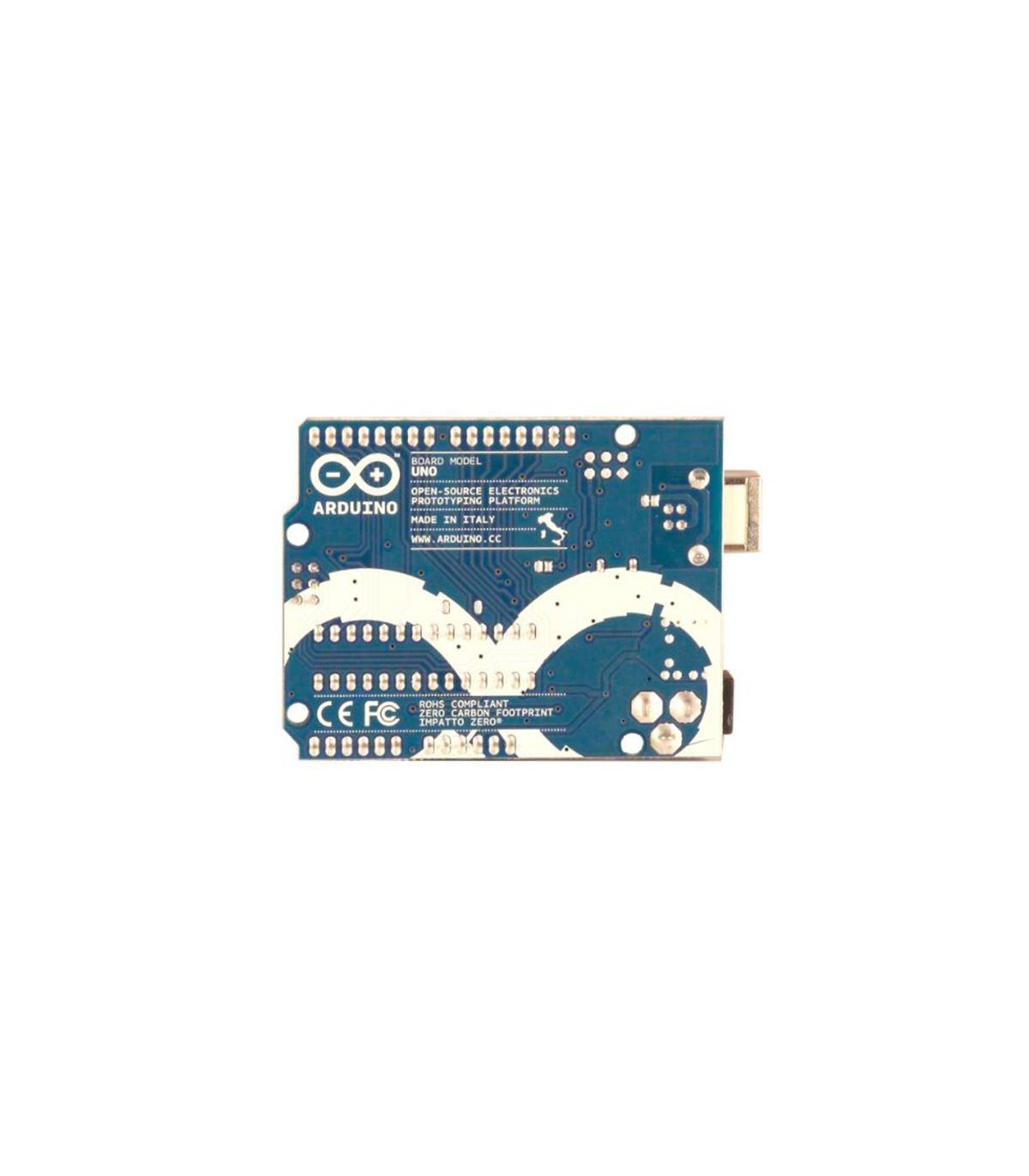 Arduino Uno контроллер построен на ATmega328. Платформа имеет 14 цифровых вход/выходов (6 из которых могут использоваться как выходы ШИМ), 6 аналоговых входов, кварцевый генератор 16 МГц, разъем USB, силовой разъем, разъем ICSP и кнопку перезагрузки. Для работы необходимо подключить платформу к компьютеру посредством кабеля USB, либо подать питание при помощи адаптера AC/DC или батареи. В отличие от всех предыдущих плат, использовавших FTDI USB микроконтроллер для связи по USB, новый Ардуино Uno использует микроконтроллер ATmega16U2. Длина и ширина печатной платы Uno составляют 6.9 и 5.3 см соответственно. Разъем USB и силовой разъем выходят за границы данных размеров. Четыре отверстия в плате позволяют закрепить ее на поверхности. Расстояние между цифровыми выводами 7 и 8 равняется 0,4 см, хотя между другими выводами оно составляет 0,25 см. Технические характеристики Микроконтроллер: ATmega328 Рабочее напряжение: 5 В Входное напряжение (рекомендуемое): 7-12 В Входное напряжение (предельное): 6-20 В Цифровые Входы/Выходы: 14 (6 из которых могут использоваться как выходы ШИМ) Аналоговые входы: 6 Постоянный ток через вход/выход: 40 мА Постоянный ток для вывода 3.3 В: 50 мА Флеш-память: 32 Кб (ATmega328) из которых 0.5 Кб используются для загрузчика ОЗУ: 2 Кб (ATmega328) EEPROM: 1 Кб (ATmega328) Тактовая частота: 16 МГц