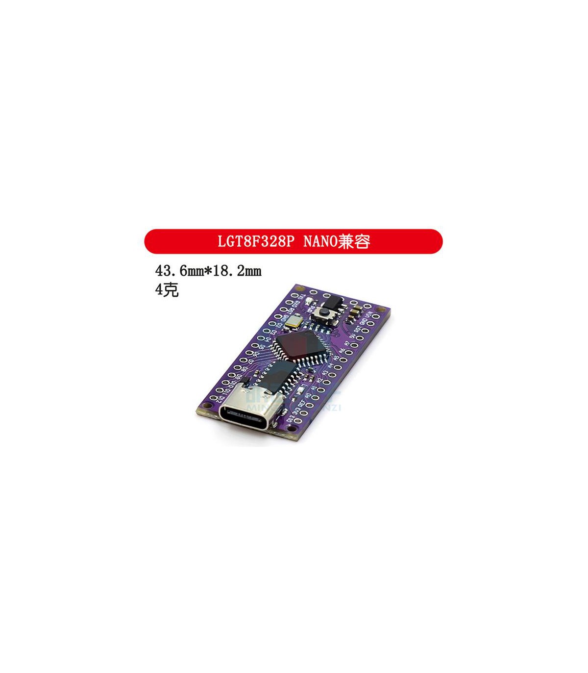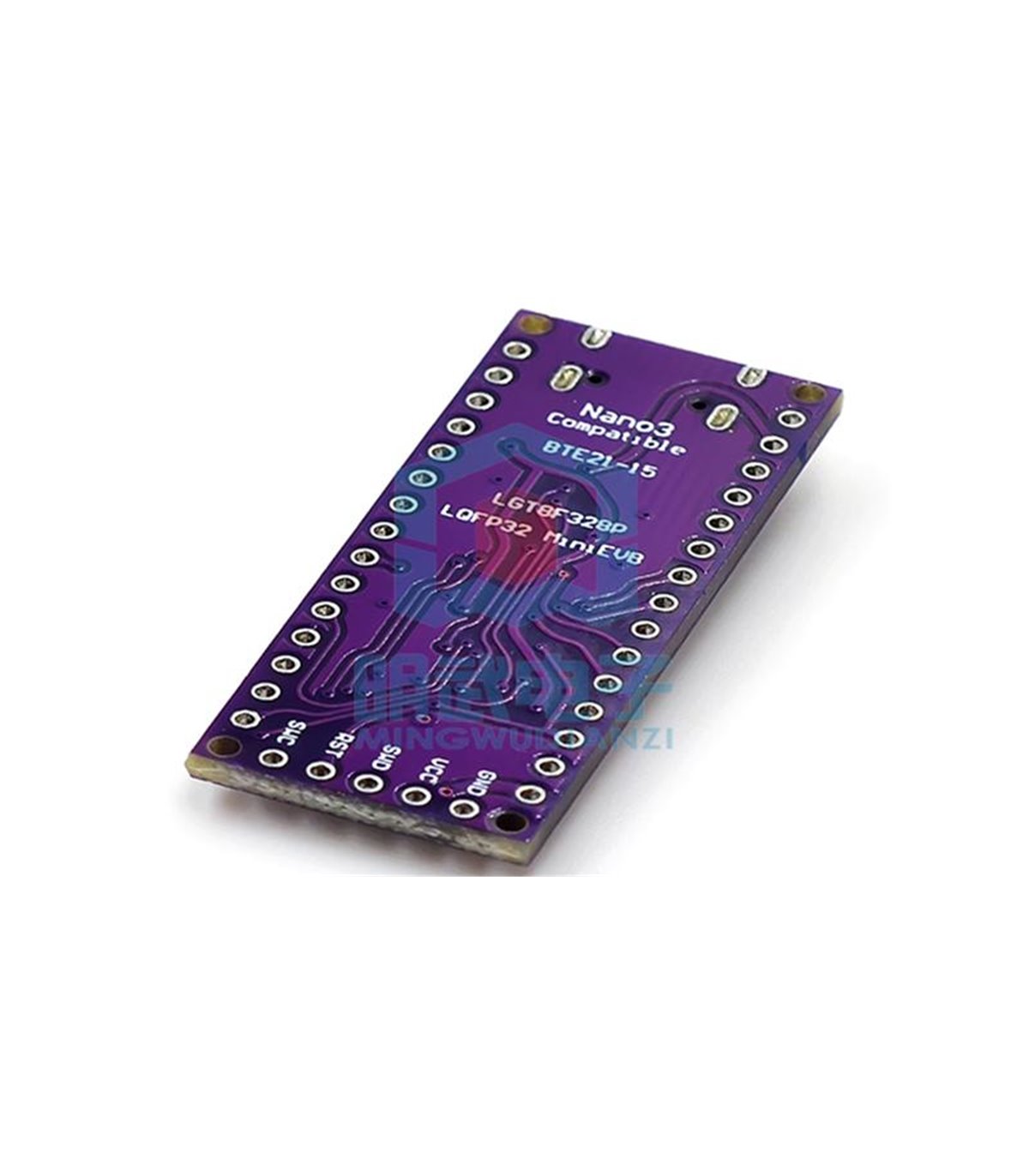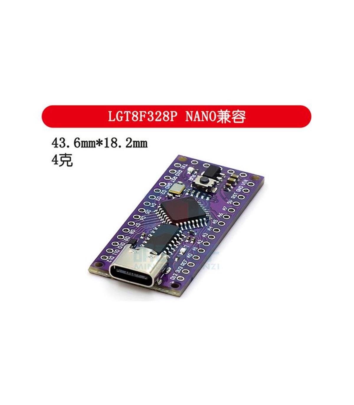 Плата контроллер LGT8F328P LQFP32 MiniEVB Arduino NANO V3.0. Клон Arduino NANO на чипе LGT8F328P от компании LogicGreen с повышенной тактовой частотой до 32МГц как от внутреннего PLL-синтезатора, так и от кварцевого генератора, регистр управления системными часами настраивается в бутлоадер.Технические характеристикиВысокопроизводительное маломощное 8-битное ядро ​​LGT8ХМ,Расширенная архитектура РИСЦ,32x8 рабочий регистр общего назначения,Внутренний однотактный множитель (8x8)Энергонезависимая память программ и пространство для храненияданных,Микросхема 32 Кбайт может быть запрограммирована в режимеонлайн,Внутренняя память данных SRAM 2 Кбайт,Программируемый аналоговый интерфейс E2PROM, поддержкадоступа к байтам,Новый алгоритм шифрования программ для обеспечения безопасностикода пользователя,Два 8-битных таймера с независимой поддержкой предыдущегоподельника, исходный режим сравнения,Два 16-разрядных таймера с независимой поддержкойпредыдущего блока для ввода и сравнение входных данных,Встроенный 32KHz калибровочный RC-генератор для функциисчетчика в реальном времени,Может поддерживать до 9 выходов PWM, 4 программируемыхуправления мертвой зоной,12-канальный 12-битный высокоскоростной аналого-цифровойпреобразователь (АЦП)Внутреннее напряжение калиброванных значений - 1.024V / 2.048V /4.096V ± 1%