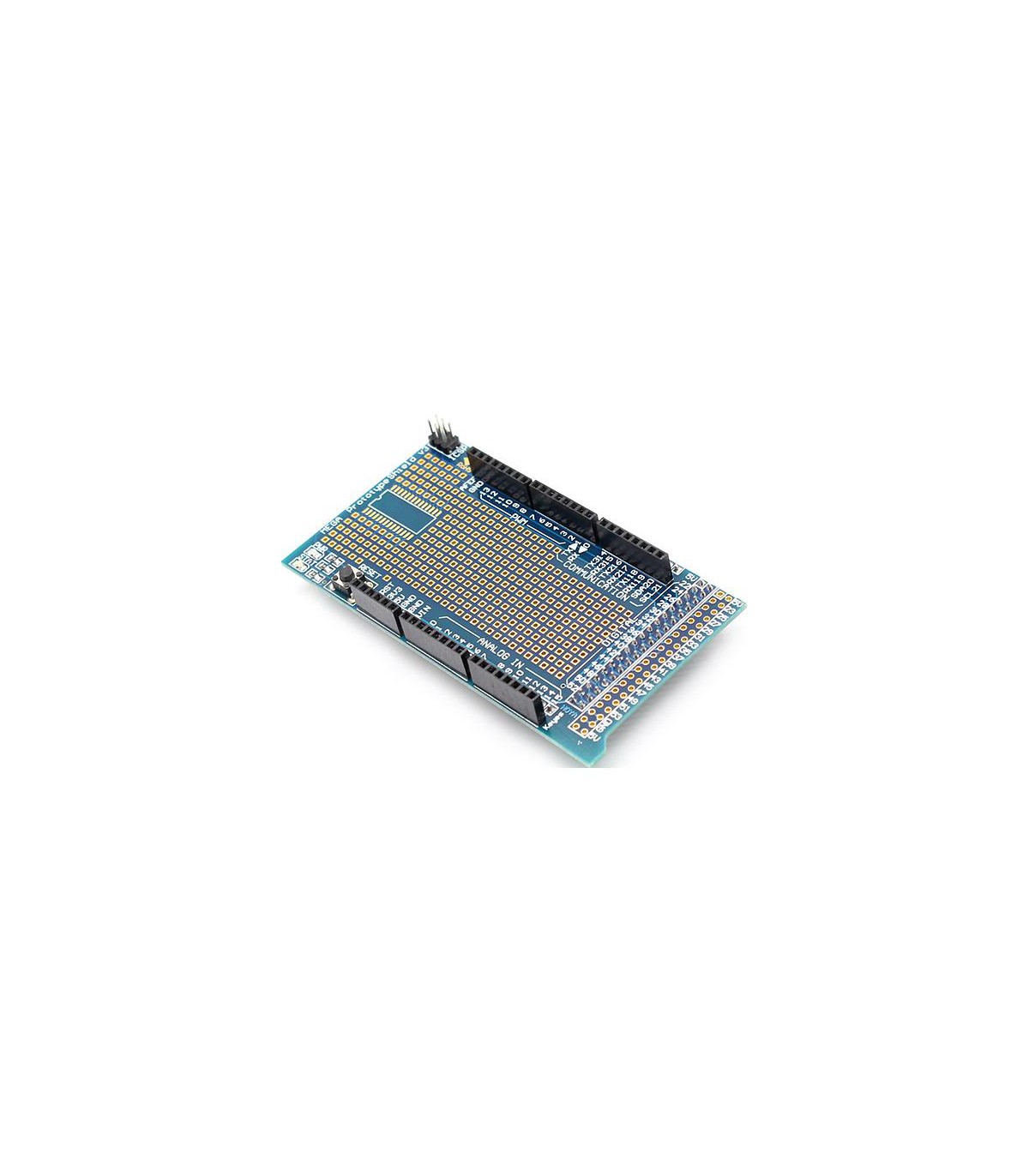 Mega Protoshield – плата расширения совместима с форм-фактором Arduino Mega и хорошо подойдет для подключения какой-либо специфической периферии, необходимой непосредственно в вашем устройстве. Выведены контактные площадки под Arduino, площадки для микросхемы в SOIC-корпусе и выводы для питания. В комплекте модуль для безпаечного монтажа элементов (макетная плата на 170 точек).