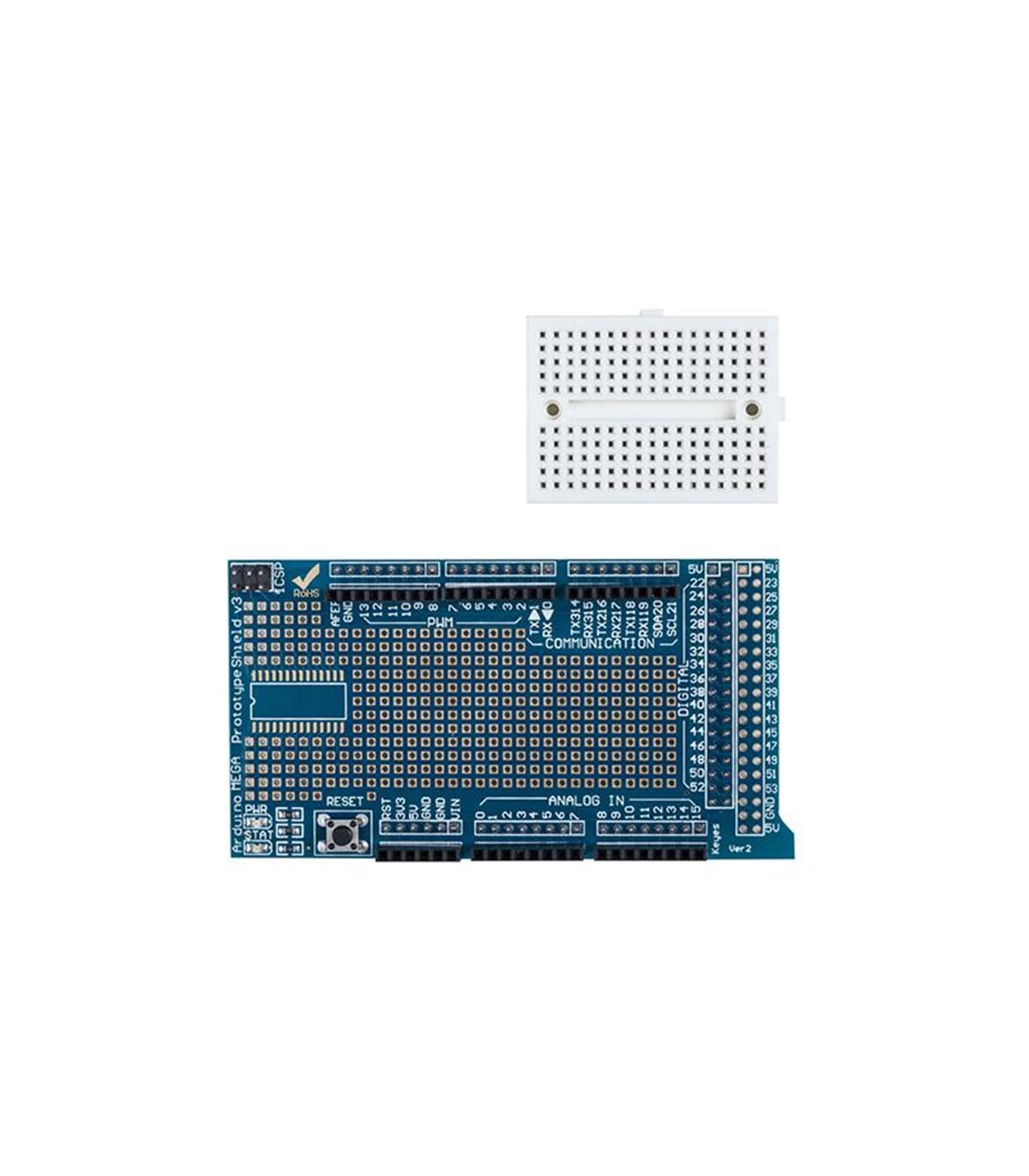 Mega Protoshield – плата расширения совместима с форм-фактором Arduino Mega и хорошо подойдет для подключения какой-либо специфической периферии, необходимой непосредственно в вашем устройстве. Выведены контактные площадки под Arduino, площадки для микросхемы в SOIC-корпусе и выводы для питания. В комплекте модуль для безпаечного монтажа элементов (макетная плата на 170 точек). Эта плата расширения является улучшенной версией стандартной платы для прототипирования. На плате расположены ICSP пены, также присутствует кнопка сброса. Расстояние между отверстиями и контактами равна плате Arduino Mega 2560 и всем платам, которые имеют такой же формат. На доске для прототипирования расположены ровно 170 отверстий-контактов позволит разработчику реализовать свой самый смелый проект. Технические характеристики Версия платы для прототипирования: Arduino Mega Protoshield V3 Наличие кнопки сброса: присутствует, вверху платы Наличие доски для прототипирования: присутствует, на 170 отверстий-контактов Наличие светодиодов: присутствуют Габаритные размеры (мм): 200х150