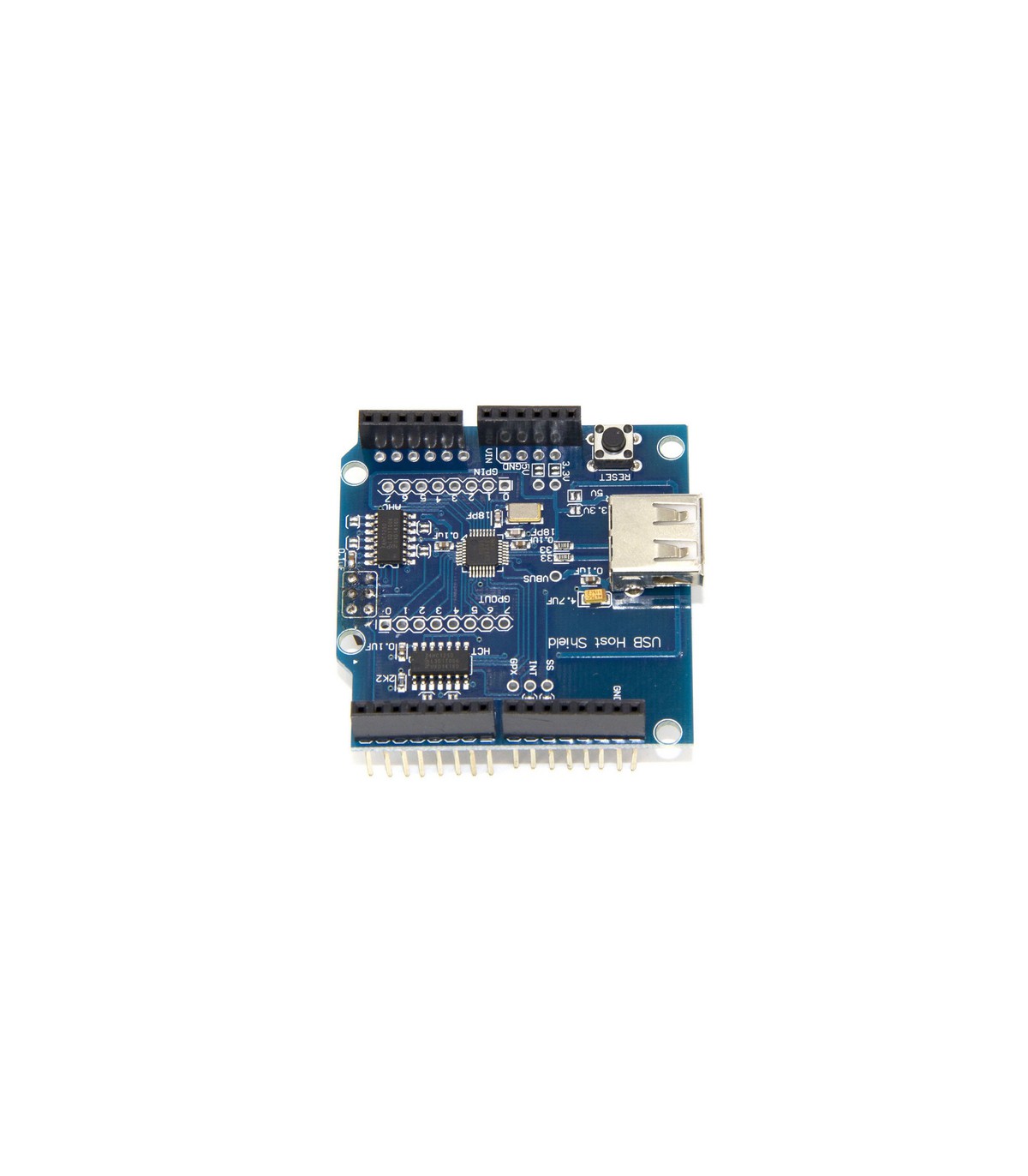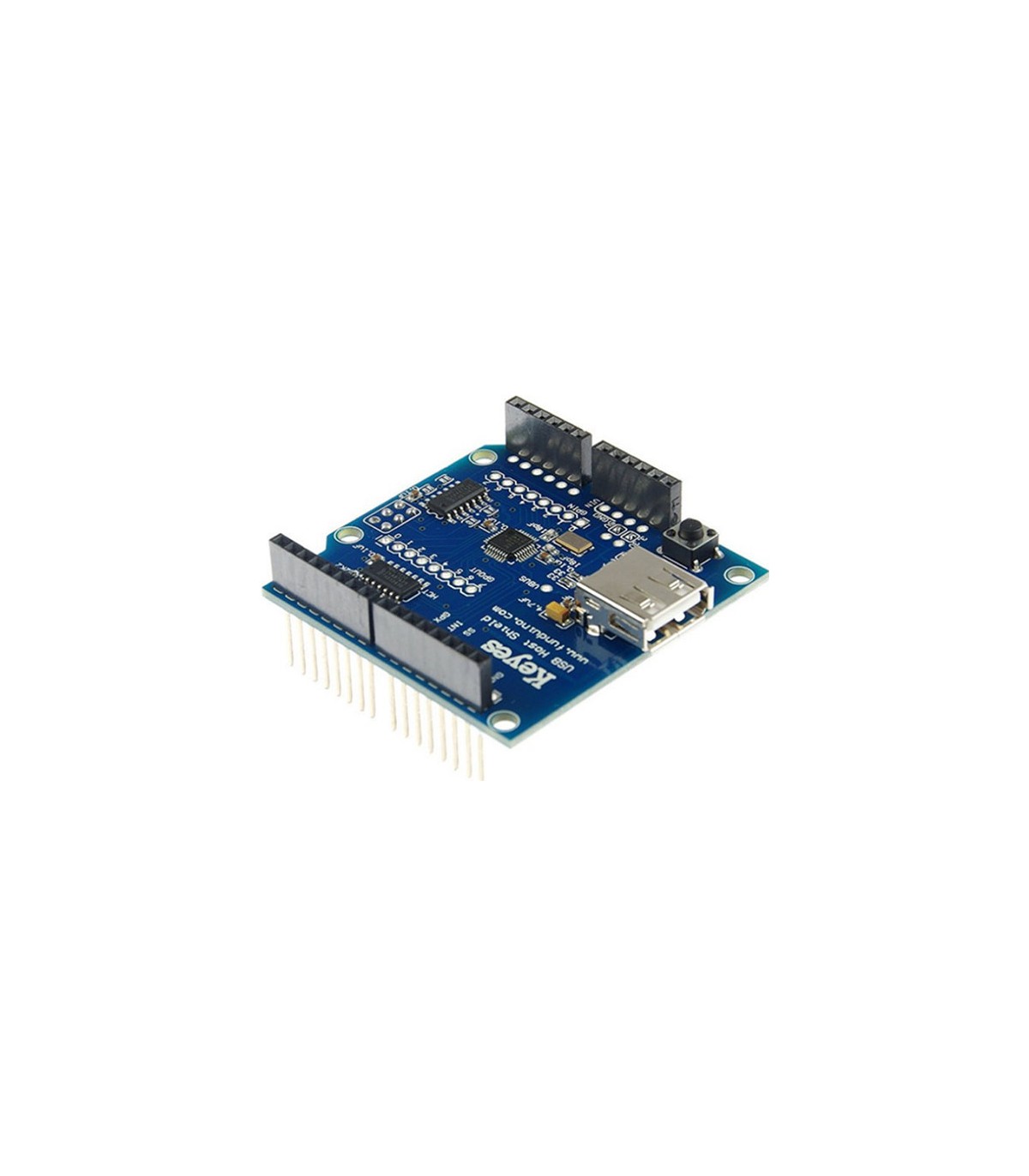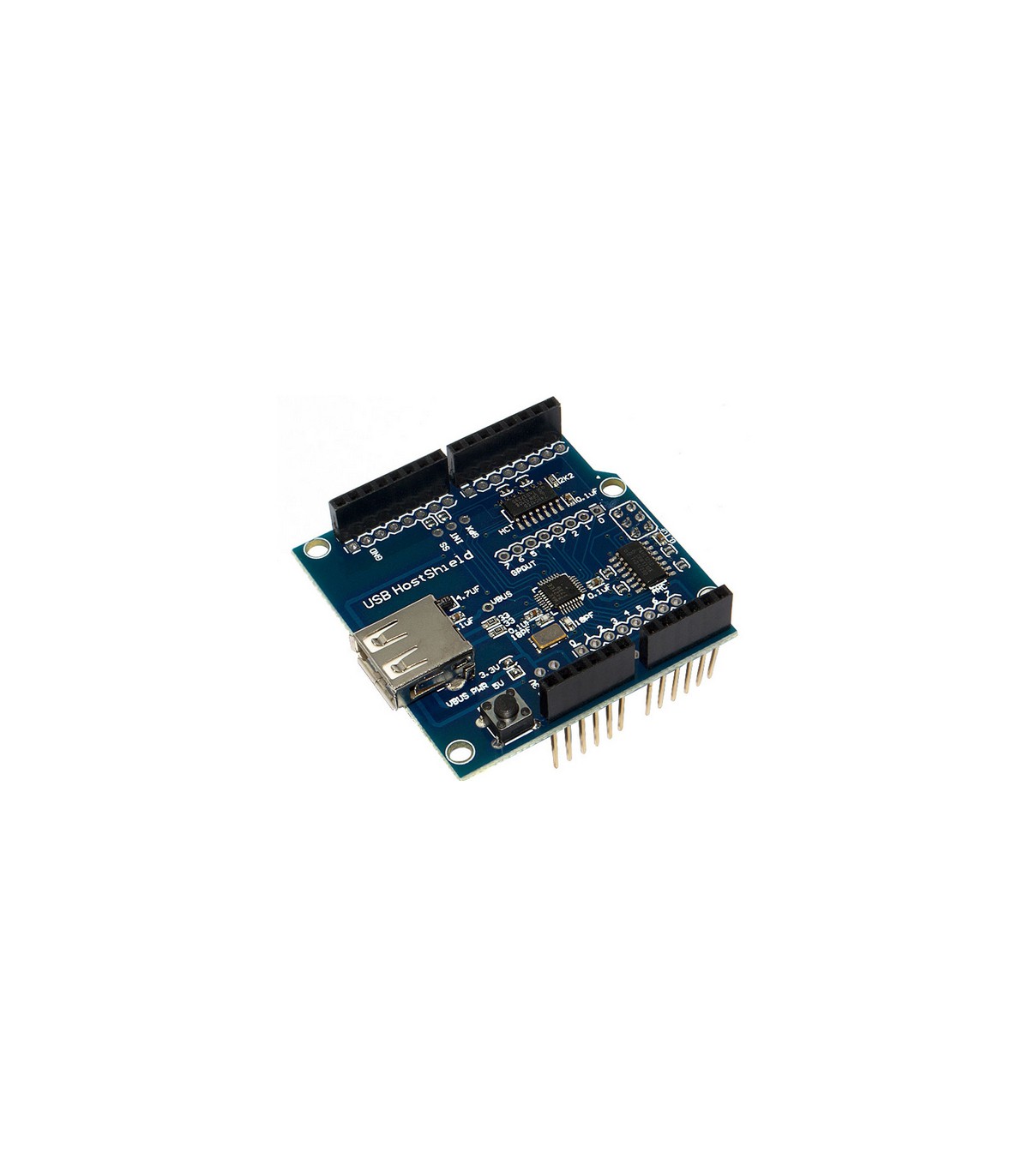 Arduino USB Host Shield поддержка Google Android ADK поддержка UNO MEGA.USB Host Shield Rev2.0 - шилд позволяющий вашей Arduino работать с устройствами на Android как Host-устройство, построен на микросхеме MAX3421EE.USB Host Shield Rev2.0 совместим с Google Android ADK.Минимальная версия Android, позволяющая работать с даным шилдом: для телефонов - 2.3.4, для планшетов - 3.1.На плате выведены 8 цифровых GPIO входов и 8 GPIO выходов, которые можно использовать для организации ввода/вывода (как небольшая компенсация за использованный SPI порт контроллера).Дополнительные служебные сигналы (INT, SS, GPX) так же удобно выведены и их легко и просто можно использовать при работе устройства.Информация от производителя