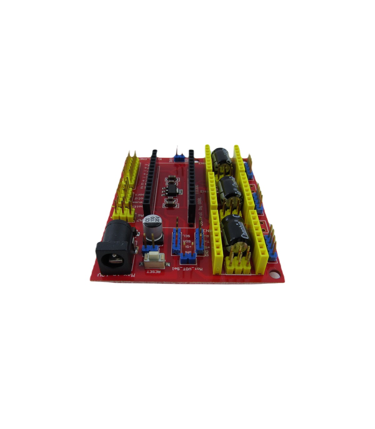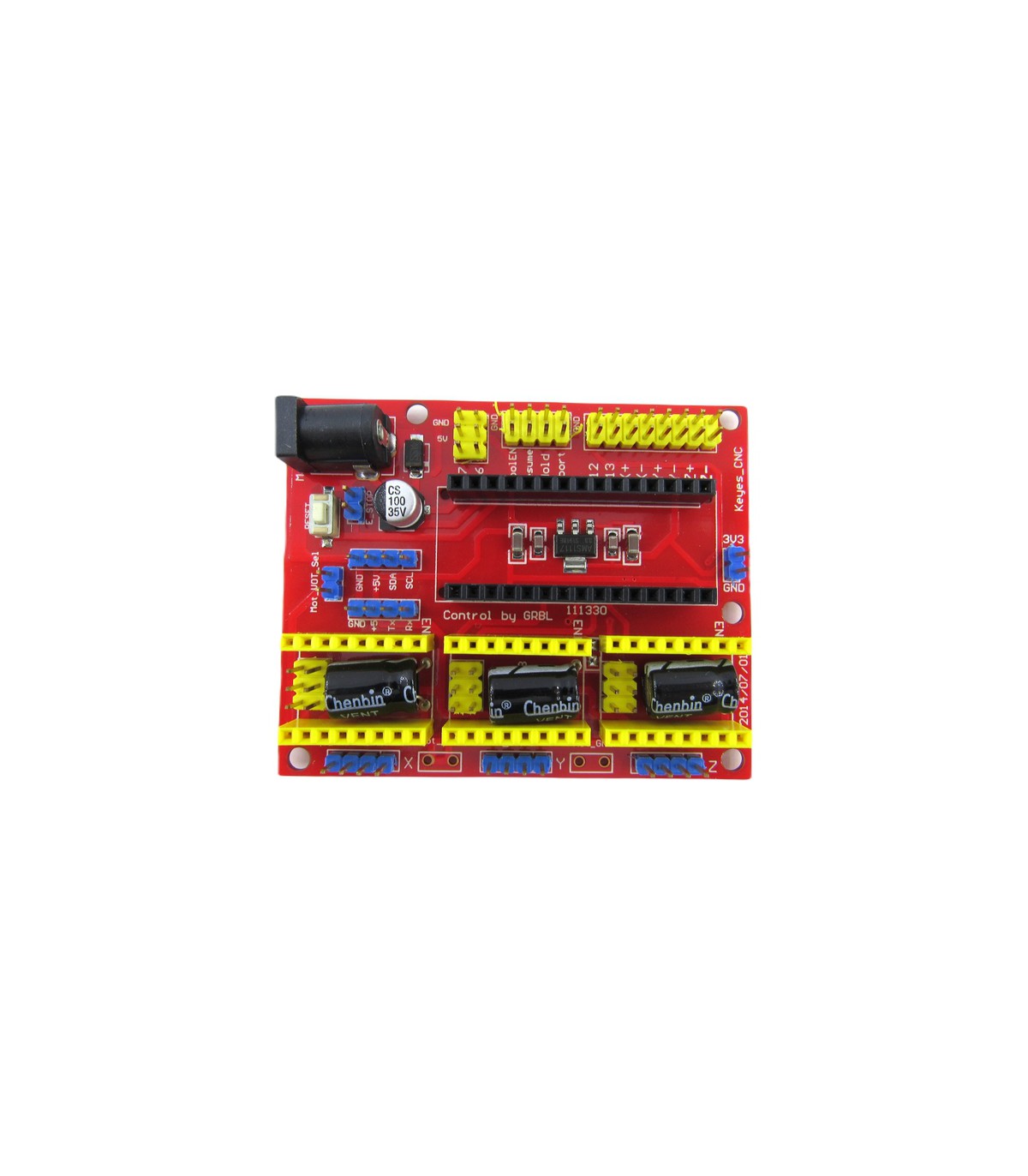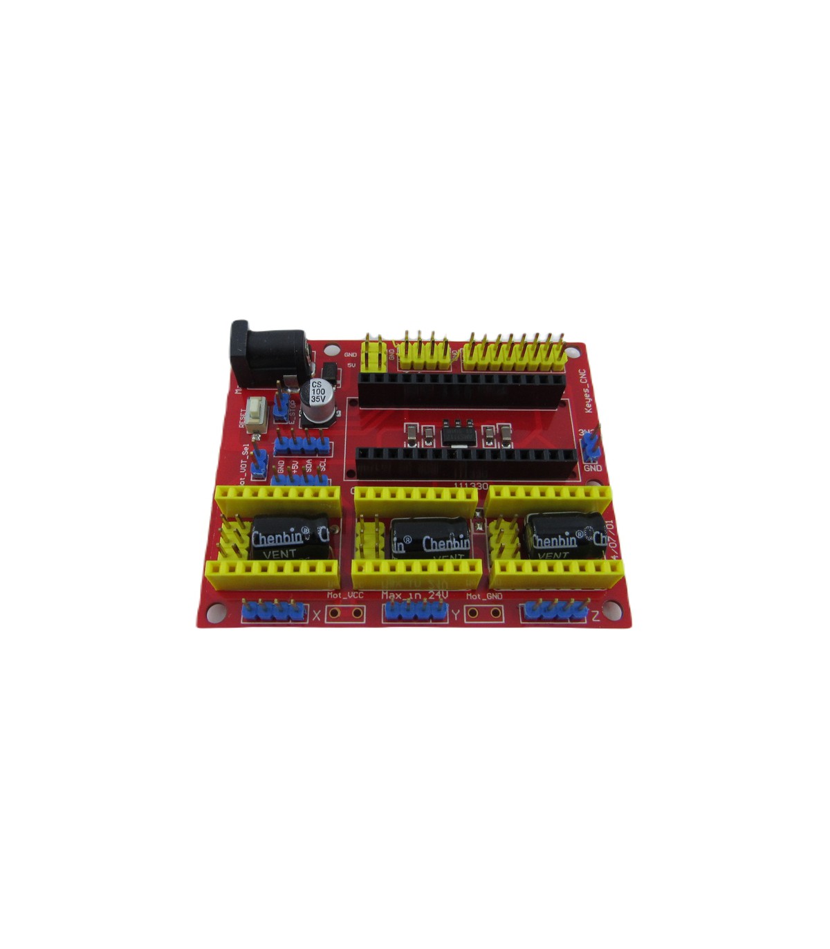 Плата расширения комплекта гравировального станка с ЧПУ Shield v4.Плата расширения Shield V4 рекомендована для контроллера Arduino Nano. С помощью Shield ревизии 4.0 Вы сможете самостоятельно собрать и запрограммировать гравировальные станки и 3D принтеры. На плате расширения CNC Shield V4 Arduio Nano может размещаться три модуля драйвера A4988, с помощью которых легко происходит управление 3-канальными шаговыми двигателями.