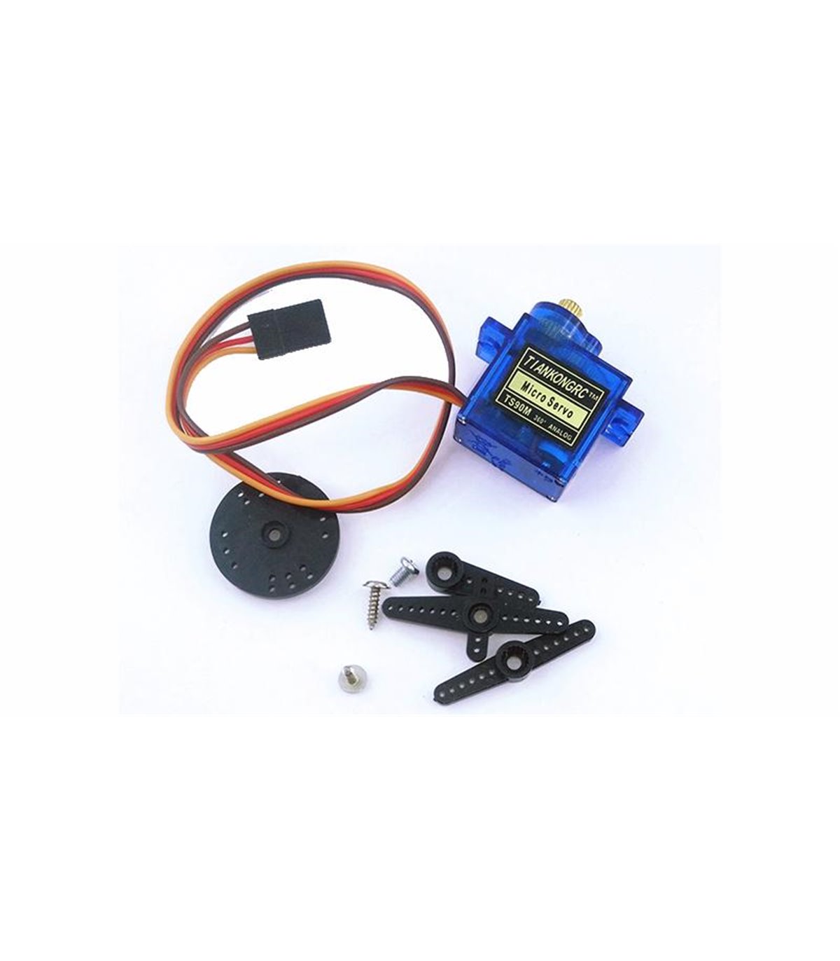 Сервопривод (также серводвигатель, сервомеханизм, сервомашина, серва) - это устройство в системах автоматического регулирования или дистанционного управления, которое за счет энергии вспомогательного источника осуществляет механическое перемещение регулирующего органа в соответствии с получаемыми от системы управления сигналов. Иными словами, сервопривод - это «автоматический точный исполнитель», который получая на вход значение управляющего параметра (в режиме реального времени), он «своими силами» (основываясь на показаниях датчика) стремится создать и поддерживать это значение на выходе исполнительного элемента. Чаще всего применяется сервомашина в машиностроении. Данный сервопривод TS90M имеет 3-х контактный кабель. Красный провод подключается к положительному полюсу источника питания, коричневый - к отрицательному, а оранжевый провод подключается к источнику подачи сигналов управления. С легкостью работает с различными контроллерами (Arduino, PIC, ARM, AVR и др.) В комплект входит три различные насадки с отверстиями для крепления на них элементов управления (тяг рулей, глубины элеронов, элементов робопроекта и прочее). Насадка представляет собой пластиковую площадку, которая крепится на редуктор серводвигателя. Также в комплект входит три винтика для крепления сервопривода и насадки.