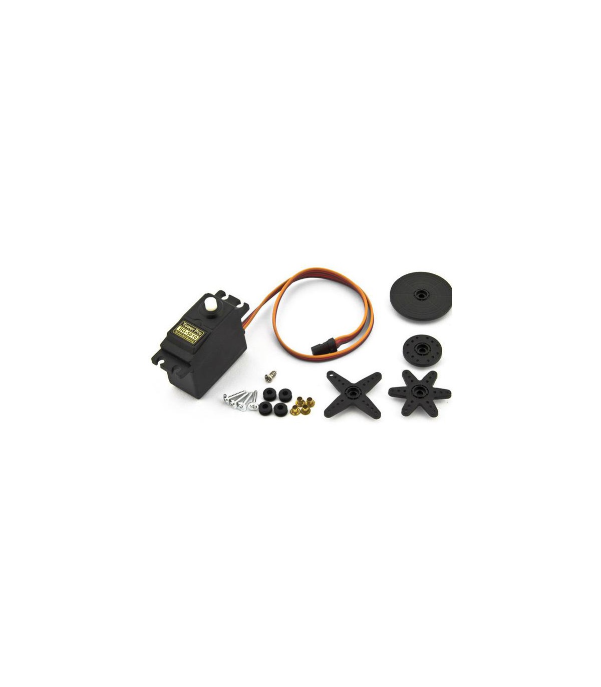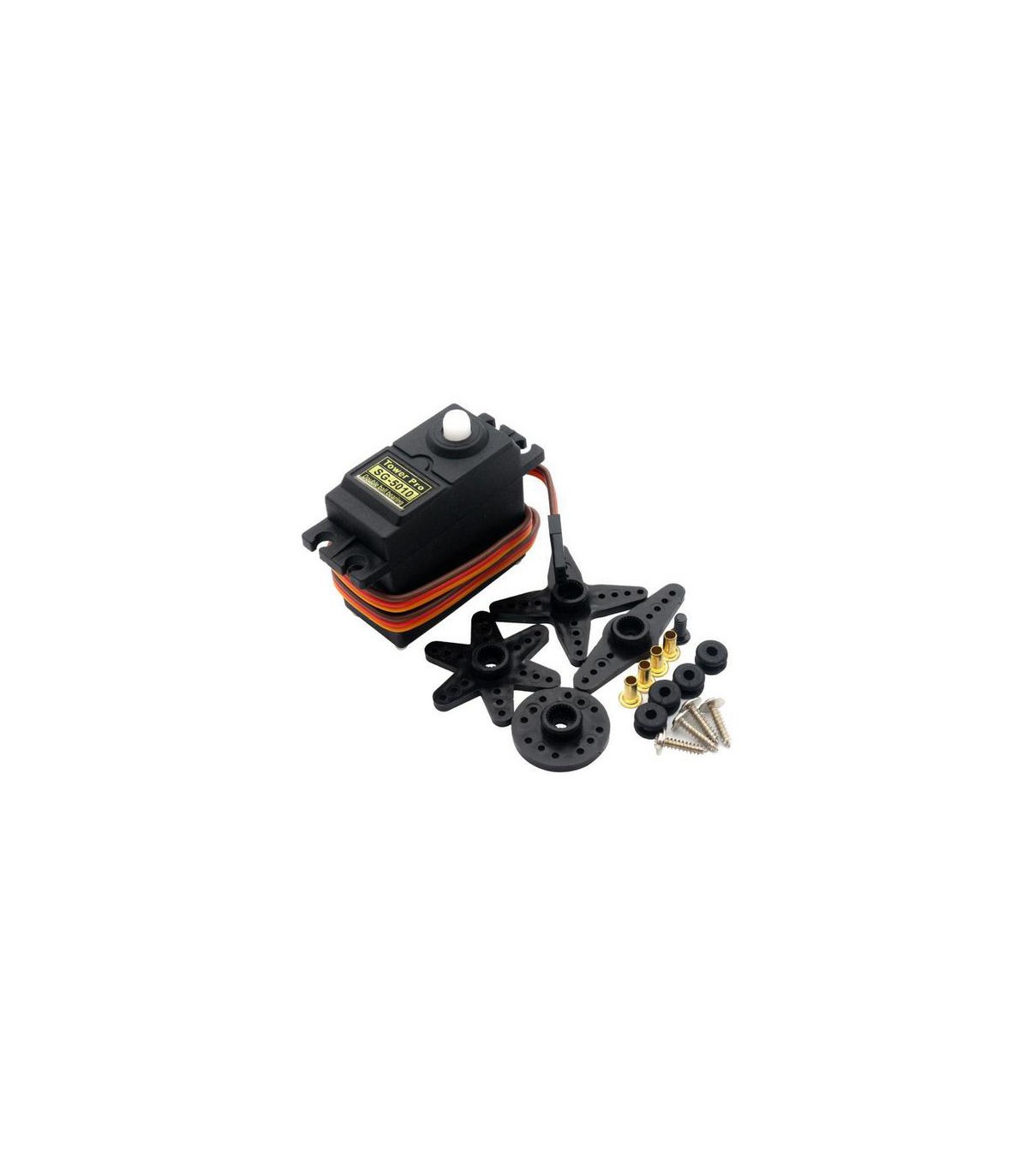TowerPro SG5010 - высококачественный и в то же время недорогой сервомотор. В комплекте с ним идет 3х-контактный кабель для подачи питания и управления, а также несколько разных насадок с креплениями.