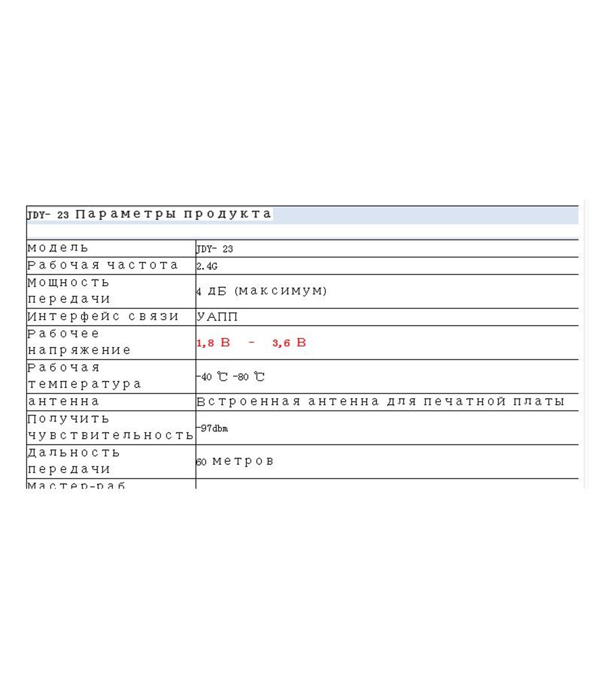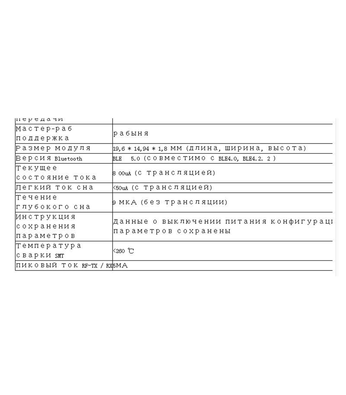 Стандарт - Bluetooth 4.2 Диапазон рабочих частот - 2.4ГГц Режим модуляции - GFSK Максимальная мощность передачи - 4дБ Максимальное расстояние передачи - 40 метров