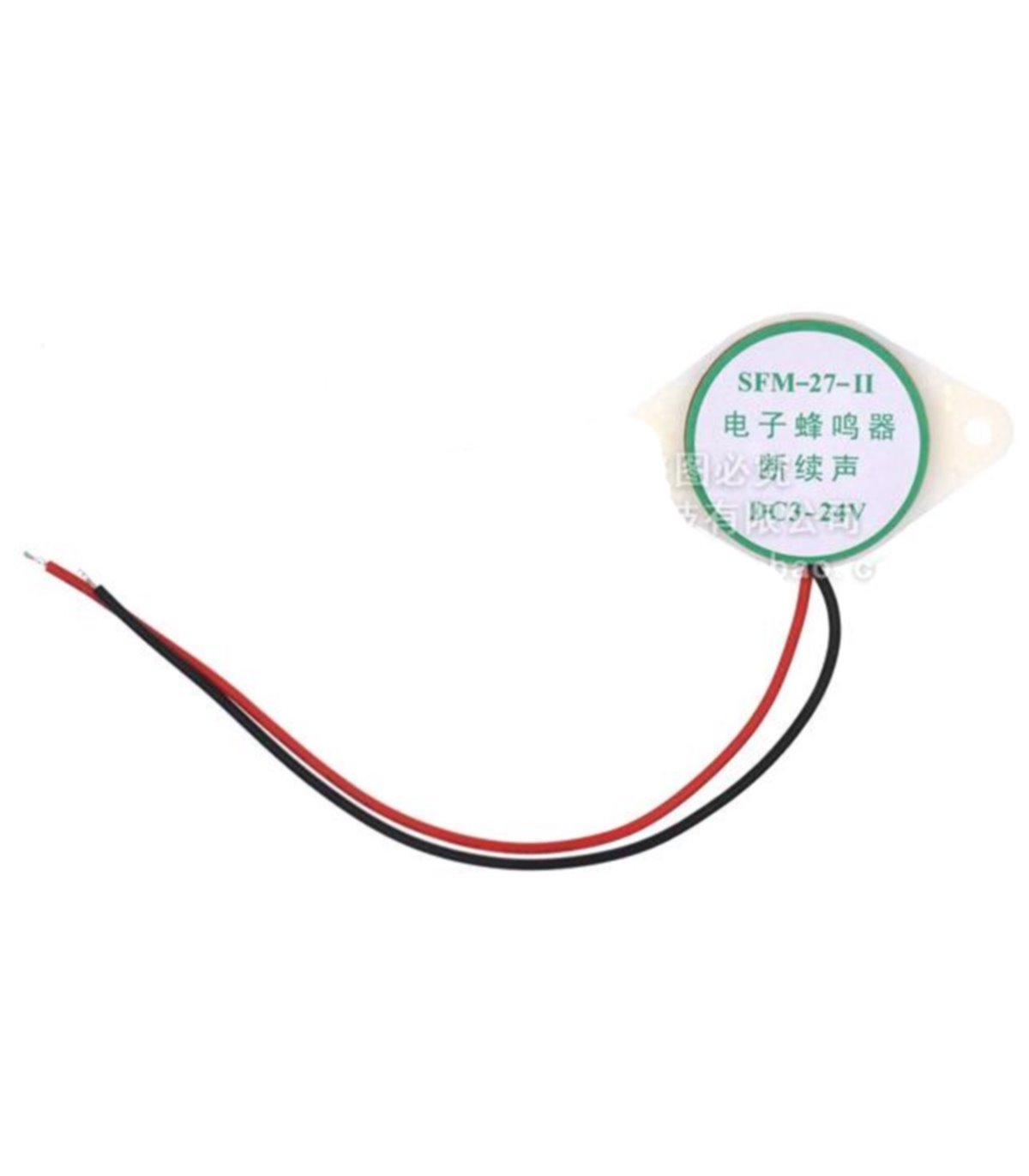 SFM-27-1 зуммер активный 3-25В buzzer пищалка прерывистый излучатель с генератором. Технические характеристики Модель: SFM-27 прерывистый Номинальное напряжение: 12 В Диапазон напряжения: 3 ~ 24V Номинальный ток: - Уровень звукового давления: > / = 90 дБ Резонансная частота: 3000 +/- 500 Гц Рабочая температура: -20 ~ 60 градусов Длина кабеля: 10 см Размеры: 4,6 х 3,0 х 1,5 см