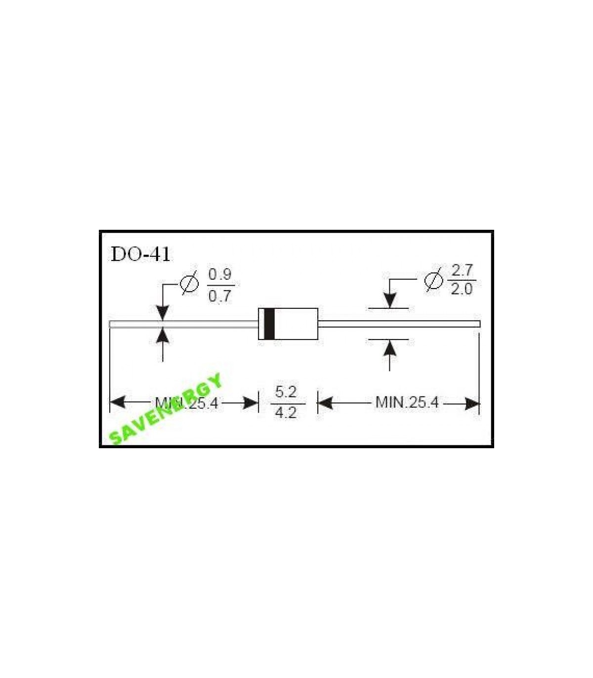 Корпус диода изготовлен из негорючей пластмассы, рабочее положение любое. Цветной полосой обозначен вывод катода. Маркировка диода AL– производитель 1N 400х – 1N400х, где х – 1,2,3,4,5,6,7 YYWW – YY – год выпуска, WW – неделя выпуска Технические характеристики Тип диода: общего применения Максимальное постоянное обратное напряжение,В: 50 Максимальный прямой (выпрямленный за полупериод) ток,А: 1 Максимальное импульсное обратное напряжение,В: 60 Максимально допустимый прямой импульсный ток,А: 30 Максимальный обратный ток,мкА 25гр: 5 Максимальное прямое напряжение,В при 25гр.: 1.1 при Iпр.,А: 1 Рабочая температура,С: -65...150 Корпус: DO204AL(DO-41) * цена указана за 10 штук