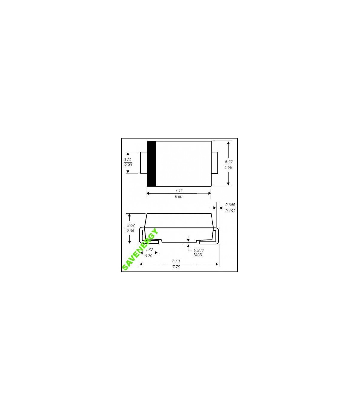 SS34 Ограничительный диод Шотки в корпусе для поверхностного монтажа. Особенности Низкопрофильный корпус Идеален для автоматического позиционирования на печатной плате Защита от перенапряжения Низкое падение прямого напряжения, низкая потеря мощности Высокая эффективность Максимальная температура при пайке на выводах 260°C, в соответствии SL level 1, J-STD-020 Бессвинцовая технология Технические характеристики Кол-во диодов: 1 VRRM,В:и 40 IF(AV),А: 3 VF (макс.),В: 0.5 IR (макс.),мкА: 500 IFSM (макс.),А: 100 TJ (макс.),°C: 125 Корпус: DO-214AB * в комплекте 10 штук