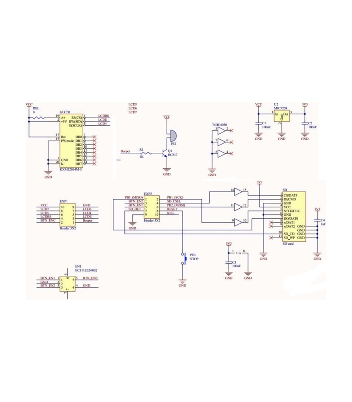 Графический LCD-12864 экран с SD ридером и шилдом для подключения к RAMPS 1.4. Подключение набора LCD12864-RAMPS-1.4 и платы RAMPS к 3D принтеру полностью избавляет от необходимости подключать 3D принтер к компьютеру через шнур USB. Модели G-Code могут загружаться непосредственно через SD-карту, а LCD12864 экран и кнопки управления позволяют контролировать ход текущей печати и при необходимости менять её параметры. Технические характеристики Тип дисплея: жидкокристаллический Разрешение дисплея: 128 на 64 точек Размеры экрана: 72 х 40 мм Регулятор контрастности 20-контактный интерфейс подключения Напряжение питания: 3 В или 5 В Габариты модуля: 93.0 х 70.0 х 7.5 мм Вес: 74 г. Важной особенностью набора LCD12864-RAMPS-1.4 является наличие кнопки экстренной остановки печати. На плате есть переменный резистор, которым осуществляется регулировка контрастности дисплея LCD. Размеры набора LCD12864-RAMPS-1.4 и схема набора LCD12864-RAMPS-1.4 есть на рисунках. Набор LCD12864-RAMPS-1.4 включает в себя: графический LCD12864 экран, SD-ридер, APLS энкодер, адаптер для подключения к плате RAMPS и два шлейфа 10-pin (длина проводников каждого шлейфа составляет 40 см). Все элементы набора LCD12864-RAMPS-1.4 легко подключаются друг к другу, а подключение к RAMPS займёт у вас считанные секунды. Набор LCD дисплея совместим с картами RAMPS версий 1.4. Поддержка дисплея LCD12864-RAMPS-1.4 прекрасно реализована в прошивке Marlin. Встроенный кард-ридер SD card позволяет загружать G-Code модели непосредственно с SD-карт. Контролировать процесс печати можно с помощью LCD дисплея и кнопок управления печатью 3D принтера. Подробное описание процесса печати смотрите в разделе 'Печать с SD-карты' инструкции по эксплуатации 3D принтера Reprap Prusa Mendel i3. Подключение На задней стороне панели управления LCD Full Graphic Smart Controller расположено два гнезда для подключения шлейфов (в комплекте) обозначены как EXP1 и EXP2, а также специальный слот для подключения SD карты (SD карта в комплект не входит). Подключение панели управления LCD Full Graphic Smart Controller к плате RAMPS 1.4 происходит через специальный переходник Smart Adapter (в комплекте). Гнёзда на переходнике (Smart Adapter) обозначены как EXP1 и EXP2 для правильного подключения. Переходник (Smart Adapter) подключается к RAMPS 1.4 через специальный разъем. При правильном подключении LCD12864-RAMPS-1.4 к RAMPS 1.4 и настройке в прошивке экран LCD будет функционировать, получая питание по подключенному USB кабелю от компьютера. Резистор регулировка контрастности LCD дисплея расположен на лицевой стороне платы с левой стороны.