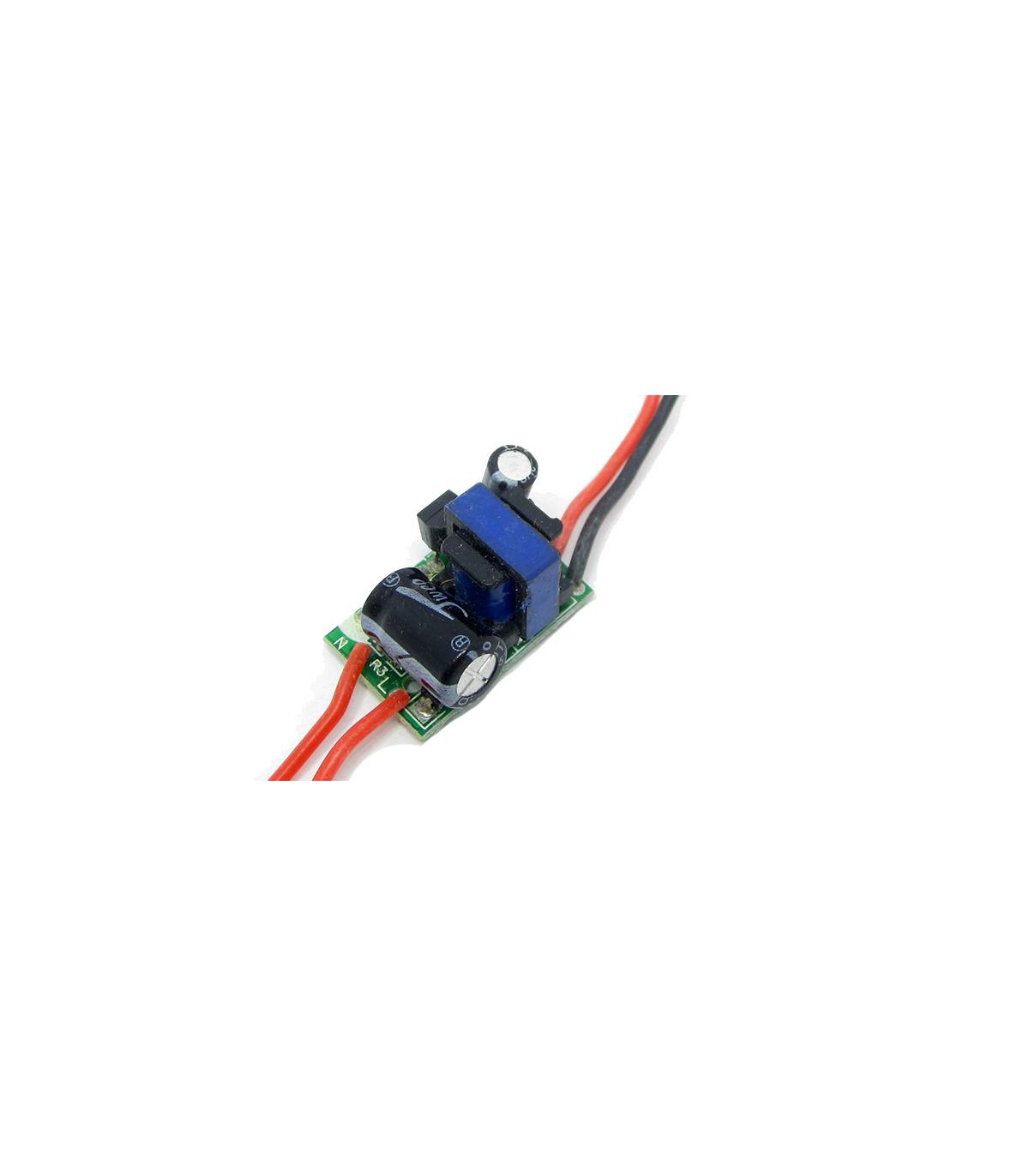 Драйвер светодиодов LED 3W.LED драйвер диммируемый 3Вт, предназначен для подключения группы до 3-их последовательно подключенных одноваттных светодиодов. Данный драйвер представляет собой источник постоянного стабилизированного тока, который выполнен в бескорпусном варианте (печатная плата с элементами).Два красных изолированных провода с одной стороны, предназначены для подачи входного напряжения 220В (полярность не важна). Два изолированных провода с другой стороны (красный, черный) ― это выход для подключения светодиодов: красный провод '+', черныйт провод '-'.