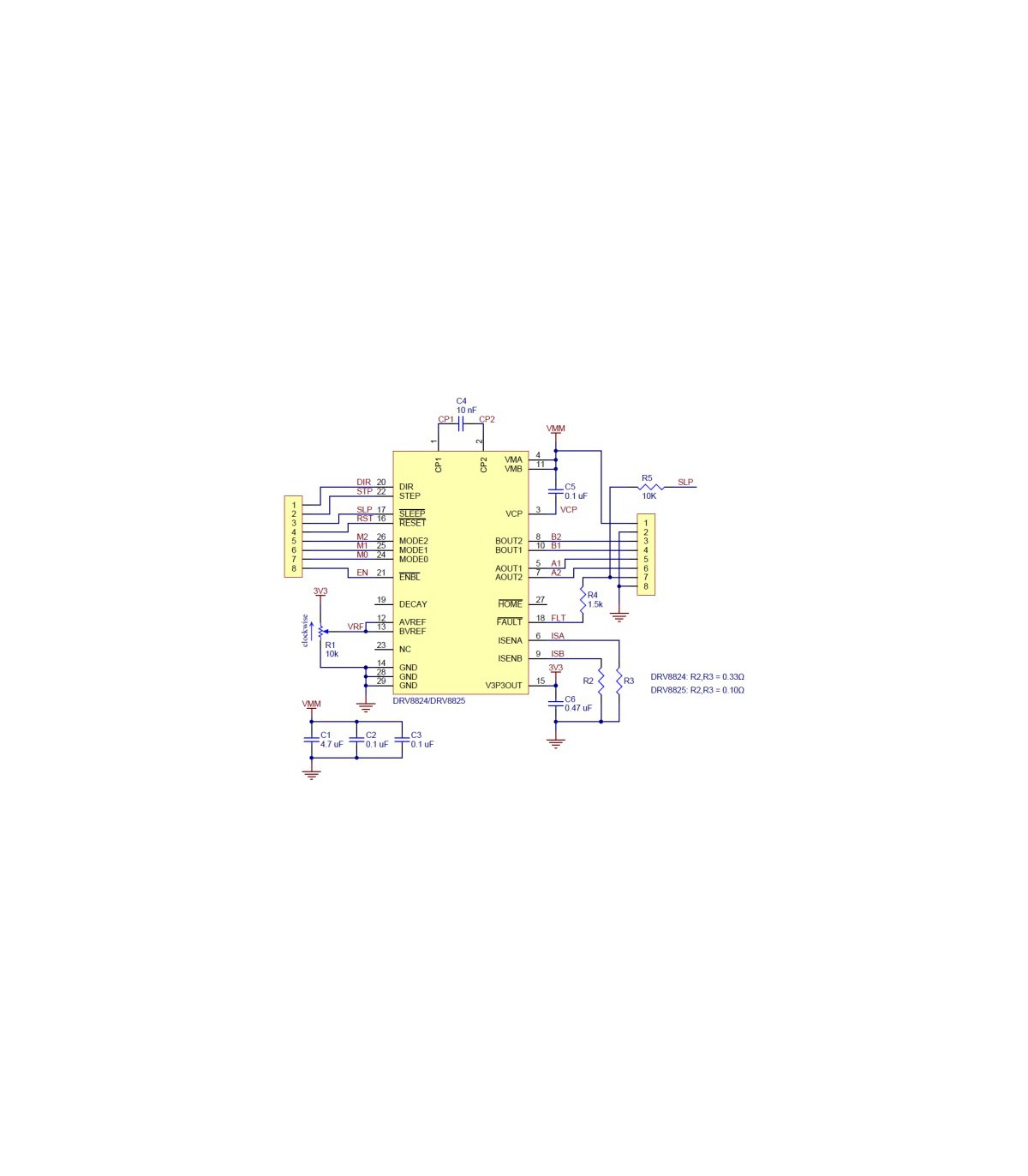 Драйвер шагового двигателя DRV8825 построенный на чипе от TI DRV8825. По выводам он идентичен A4988. Работает с шаговыми двигателями напряжением от 8.2 до 45В и током до 1.5А на фазу (до 2.2А при воздушном охлаждении).