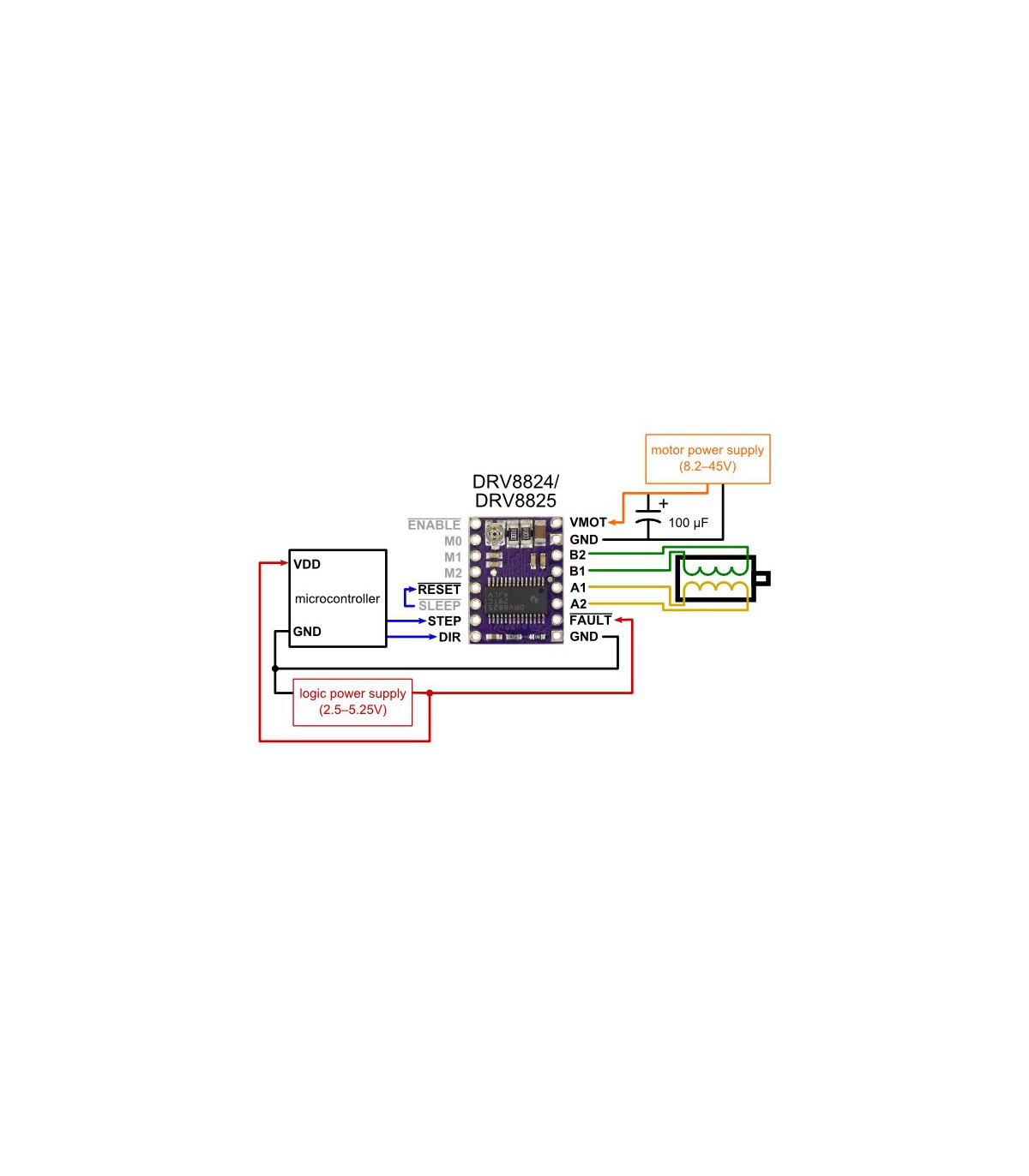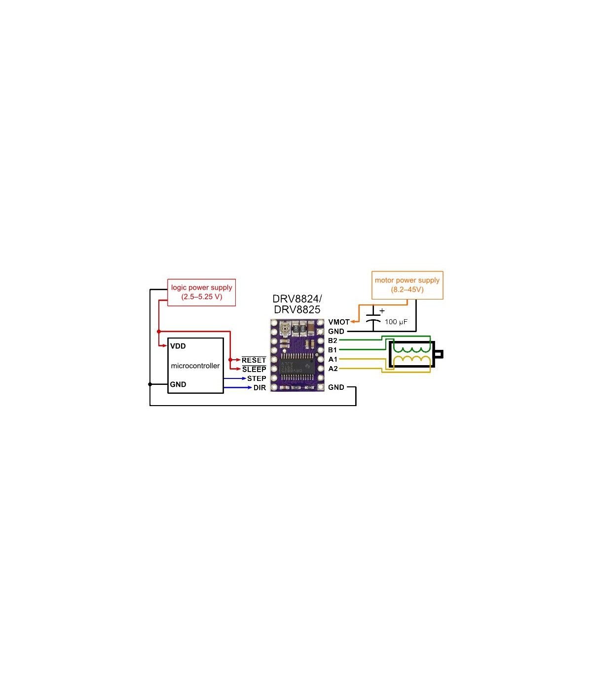 Драйвер шагового двигателя DRV8825 построенный на чипе от TI DRV8825. По выводам он идентичен A4988. Работает с шаговыми двигателями напряжением от 8.2 до 45В и током до 1.5А на фазу (до 2.2А при воздушном охлаждении). Минимальный микрошаг: 1/32. DRV8825 позволяет регулировать выходной ток, имеет защиту от перенагрузки и перегрева, шесть вариантов микрошага (полный шаг, полшага, 1/4, 1/8, 1/16 и 1/32 шага. Технические характеристики Модель: DRV8825 Напряжения питания: от 8.2 до 45 В Возможность установки шага: от 1 до 1/32 от максимального шага Напряжение логики: 3.3 или 5 В Защита от перегрева: отключение при нагревании драйвера до 150° С Максимальный ток на фазу: 1.5 А без радиатора, 2.2 А с радиатором Размер платы: 15 х 15 мм Габариты драйвера: 19 х 15 х 11 мм Габариты радиатора: 9 х 5 х 9 мм * в комплекте с радиатором