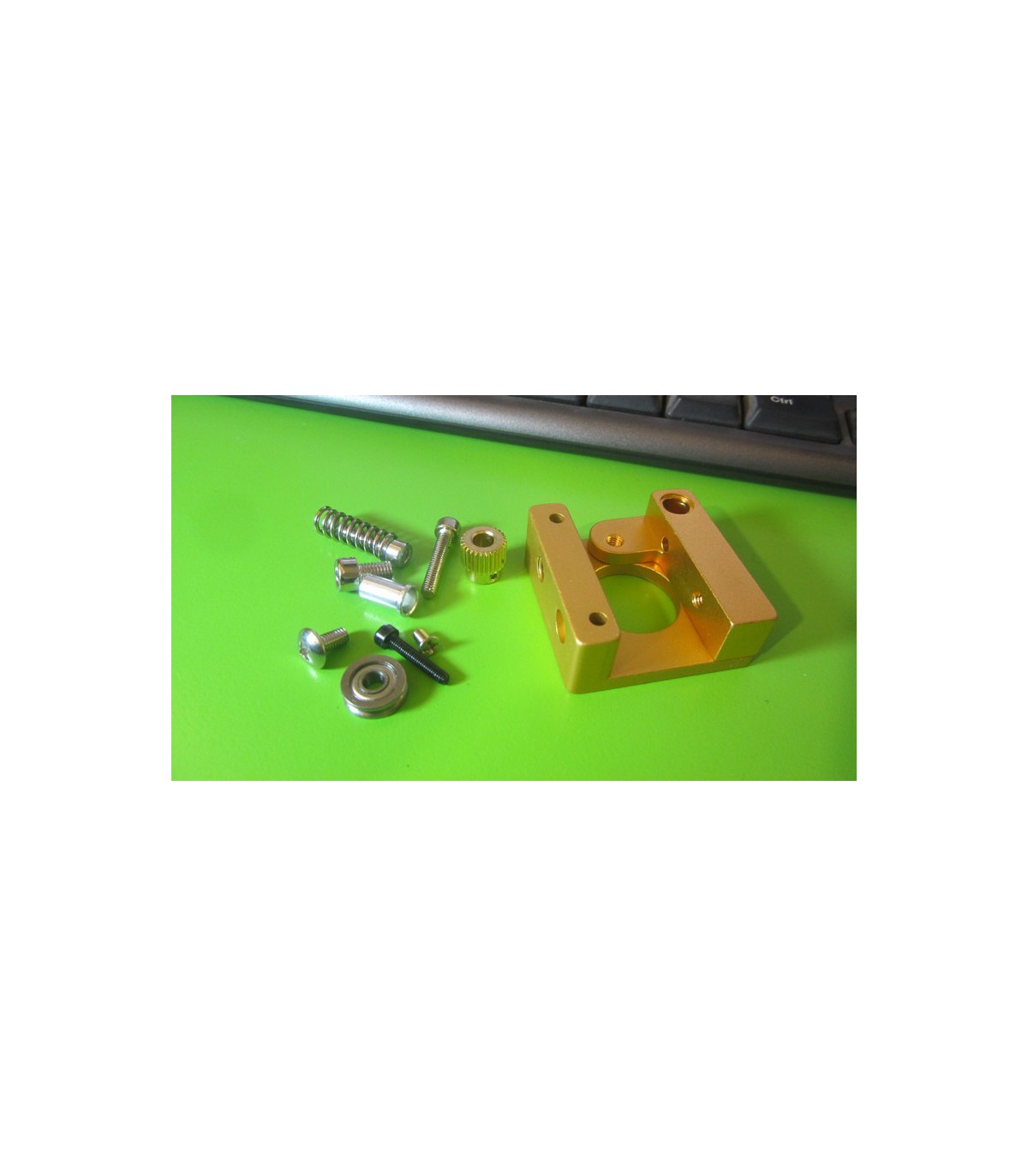 Головка блока экструдера MK8 используется на многих самодельных 3D принтерах, а так же является частью продаваемых в сборе экструдеров МК8. Головка состоит из основания головки блока, закрепляемого при помощи винтов к шаговому двигателю, чаще всего используются двигатели NEMA17. К основанию прикрепляется рычаг с прижимным подшипником, на валу двигателя закрепляется подающая шестеренка. Для регулировки степени прижима пластиковой нити прижимным подшипником к подающей шестеренке используется упругая стальная пружина. В основании и рычаге блока имеются сквозные резьбовые отверстия для закрепления термобарьеров, а так же отверстия для крепления блока на двигателе и установки регулировочных винтов с пружиной. Основание и рычаг головки выполнены из качественного алюминиевого сплава окрашенного в бронзово-золотистый цвет. Собранная головка блока выполняет роль механизма подачи пластика. Сверху на головку закрепляется система охлаждения, приобретаемая отдельно. Данная головка может служить как отдельной частью при по-элементном сборе принтера или как элемент на замену к экструдеру MK8. Технические характеристики Совместимый тип экструдера: MK8 Тип головки: правосторонняя Материал: алюминиевый сплав Размер основы: 42х42х18 мм Вес комплекта: 60 г Комплектация Алюминиевый рычаг Основа головки блока Прижимно-регулировочная пружина Втулка рычага Подающая шестеренка Прижимной подшипник Набор винтов для крепления.