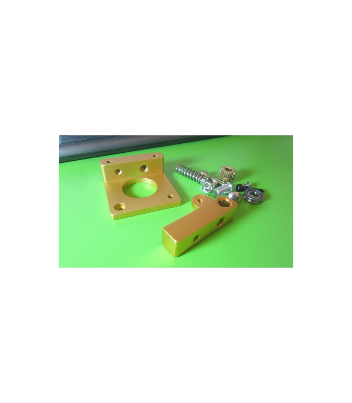 Головка блока экструдера MK8 используется на многих самодельных 3D принтерах, а так же является частью продаваемых в сборе экструдеров МК8. Головка состоит из основания головки блока, закрепляемого при помощи винтов к шаговому двигателю, чаще всего используются двигатели NEMA17. К основанию прикрепляется рычаг с прижимным подшипником, на валу двигателя закрепляется подающая шестеренка.