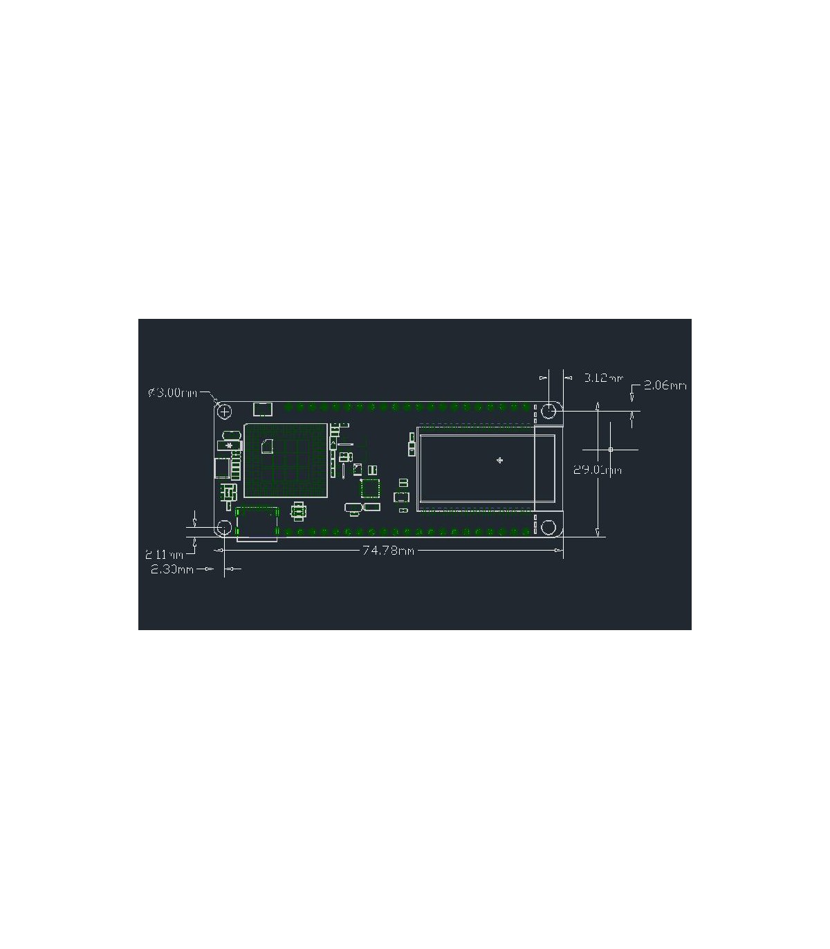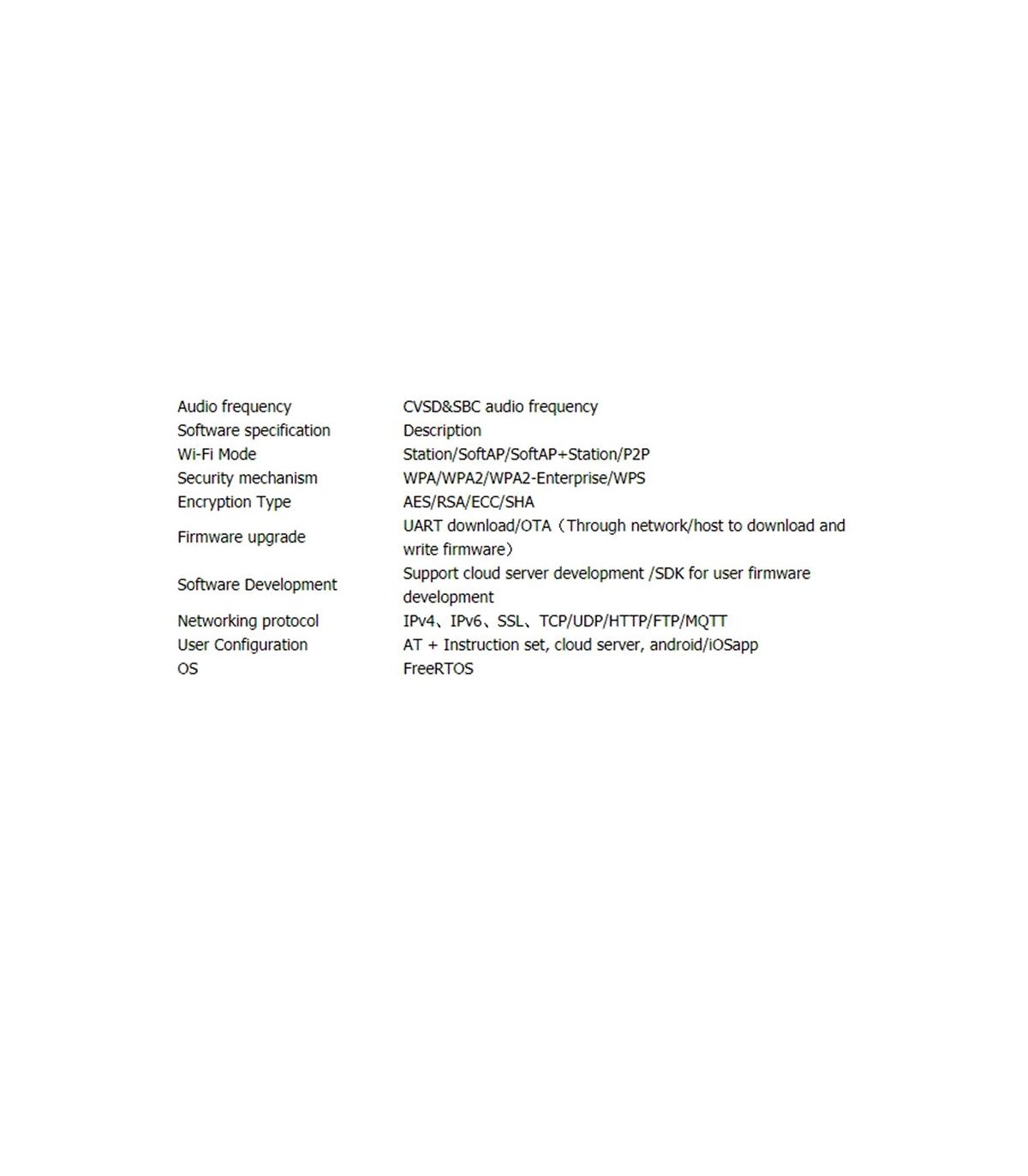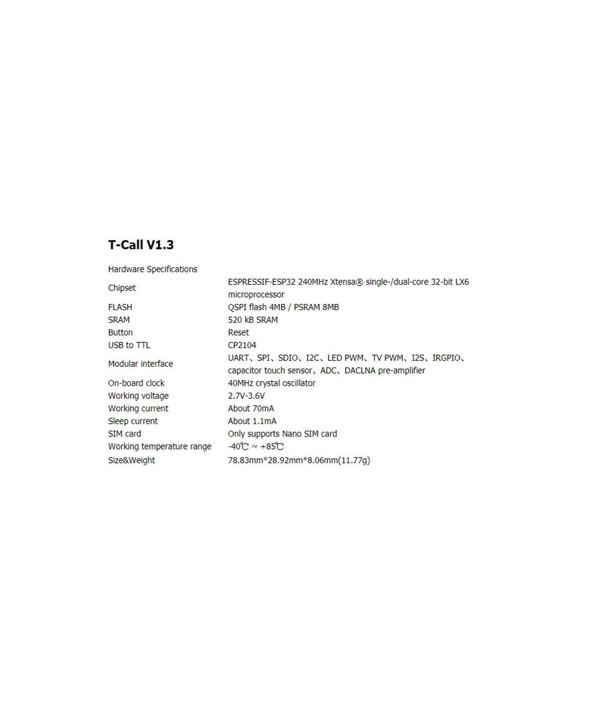 Модульный интерфейс:UART, SPI, SDIO, I2C, LED PWM, TV PWM, I2S, IRGPIO, сенсорный датчик конденсатора, АЦП, предварительный усилитель DACLNA Бортовые часы:Кварцевый генератор 40 МГц Рабочее напряжение:2.7V-3.6V Рабочий ток :70 мА Сонный ток:300 мкА Сим-карта:Поддерживает только SIM-карту Nano Диапазон рабочих температур -40 ℃ ~ + 85 ℃ Размер и вес: 78.83mm * 28.92mm * 8.06mm (11.77g)