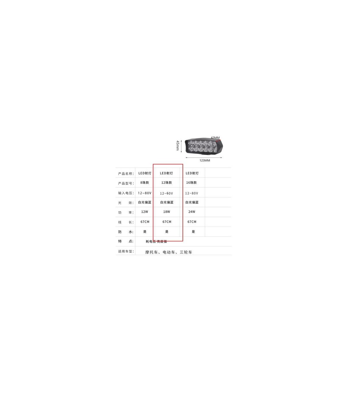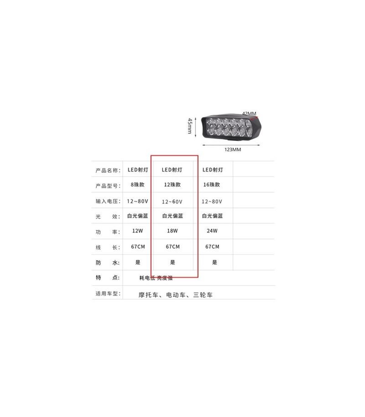 Универсальная мощная фара для электровелосипеда 1800Lm 12-60V.Технические характеристикиМощность: 18W (12x 1,5W)Led диодов: 12 шт.Вольтаж: DC 12-60VЯркость 1800 LmЦвет: 5700-7000KМатерал: пластикРазмер:Ширина - 115ммВысота - 45ммГлубина - 55мм