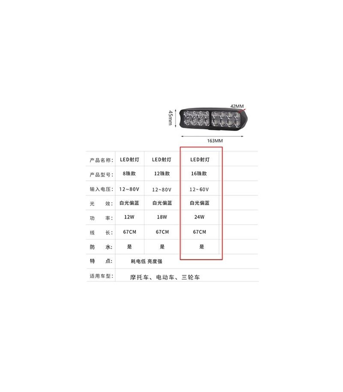 Технические характеристики Светодиодная фара L23 Мощность: 24W (16x 1,5W) Led диодов: 16 шт. вольтаж: DC 12-85V Яркость 2400 Lm Цвет: 5700-700K Матерал: Пластик Размер: Ширина - 160мм Высота - 55мм Глубина - 55мм