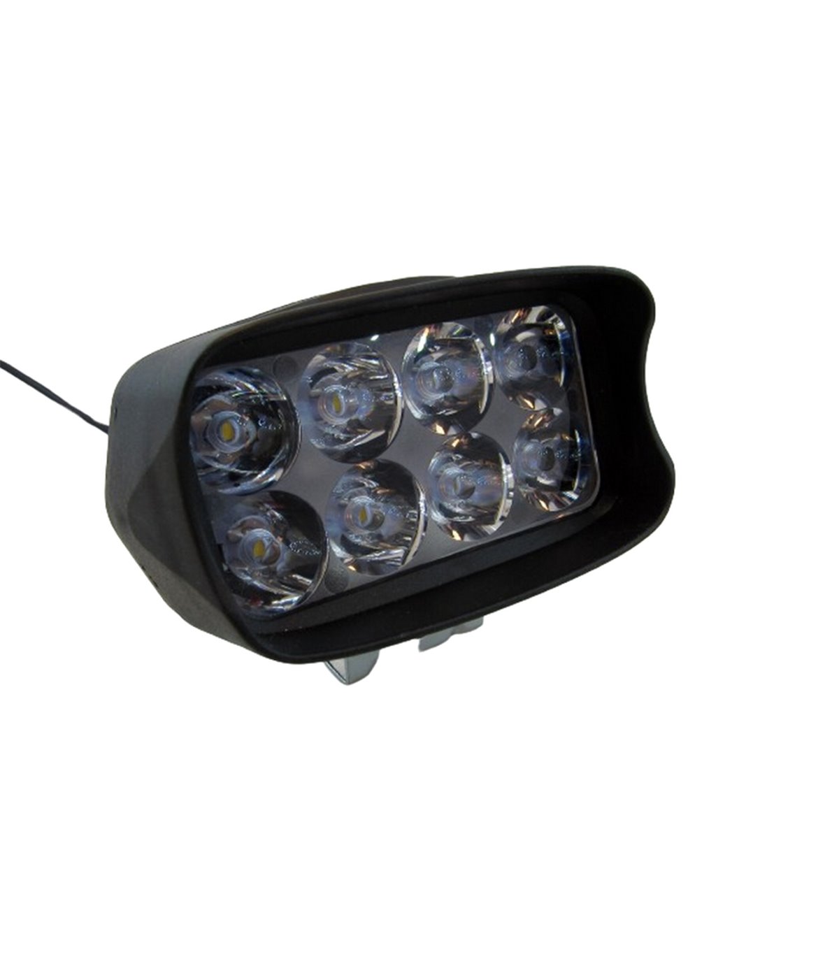 Светодиодная LED фара ближнего света на 8 диодов, общей мощностью 24Вт. Корпус выполнен из пластика. Диоды суммарно дают 24 Вт общей мощности. Поддерживает напряжение от 12 до 90 Вольт. Яркий свет, широкий луч. LED фара устанавливается на мотоцикл, квадроцикл, внедорожник, спецтехнику. Монтируется на крыше, бампере и капоте как дополнительный свет. Корпус в светодиодной фаре подогнан плотно, что дает защиту от пыли и влаги. В комплект поставки входит одна LED фара и кронштейн. Заявленная длительность работы более 20000 часов. Явным преимуществом этой фары является необычный корпус и низкая цена.