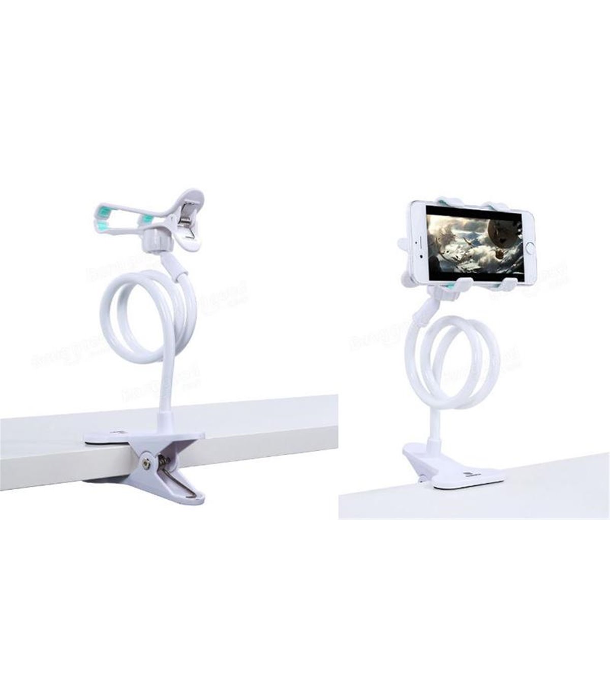 Гибкий держатель для телефона смартфона. Цвет - белый. Прочный и надежный, используется при съемках видео или фото. Экономичный и простой в использовании. Состоит из прищепки на стол, гибкого держателя и прищепки на телефон. Прищепка телефона крепится с помощью гайки. Длина держателя - 60, максимальный размер телефона - до 6 дюймов, оптимальный - до 5.5 дюймов, максимальный размер крепильной поверхности - 3см.