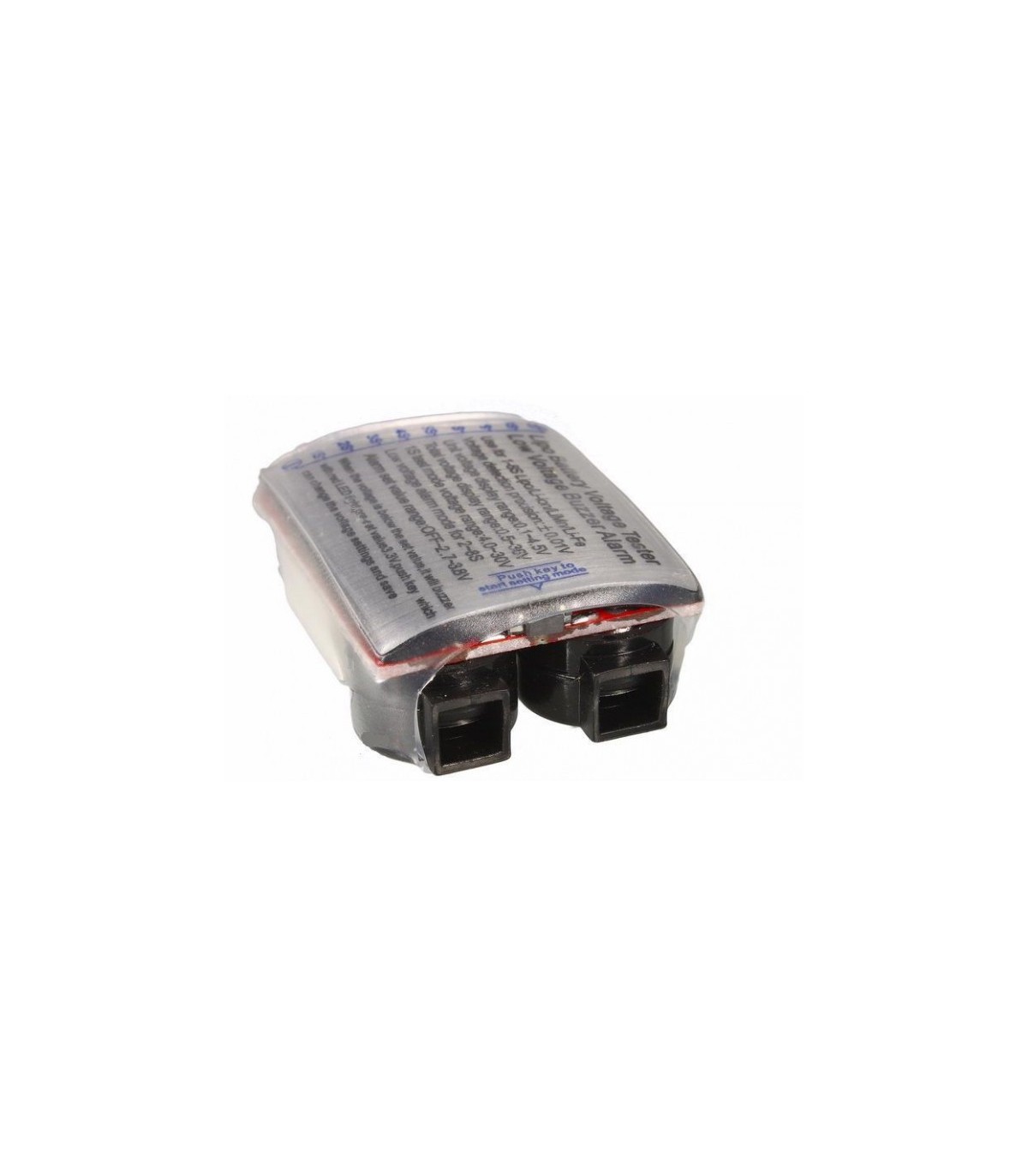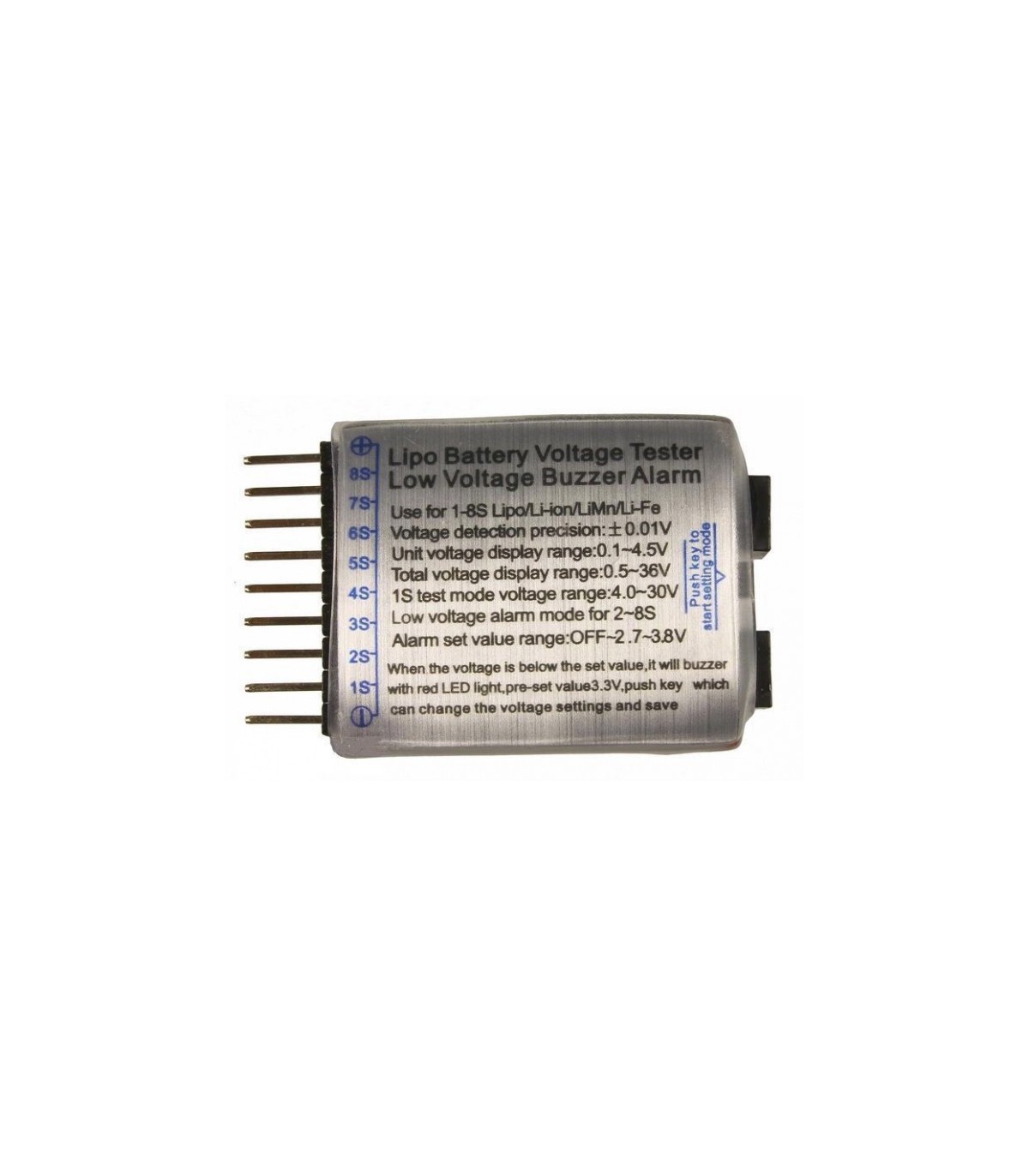 Індикатор напруги для 1S - 8S Li-Ion / Li-Po акумуляторних батарей з функцією попередження про низькій напрузі. Мініатюрний індикатор напруги для Li-Ion (Li-Pol) акумуляторних батарей з вихідною напругою від 3.7В до 29,6В. Модуль має функцію звукового попередження про гранично низькій напрузі на якійсь комірці в батареї. Значення порогового напруги, при якому буде спрацьовувати оповіщення задається за допомогою кнопки, розташованої у верхній частині модуля і може варіюватися в діапазоні від 2,7В до 3,8В. Підключення до акумуляторної батареї здійснюється за допомогою стандартного балансування роз'єму JST (XH). Дисплей буде по черзі відображати значення напруги на кожному осередку і загальну напругу батареї. Габарити індикатора напруги для Li-ion батарей складають 35мм х 26мм х 13мм.