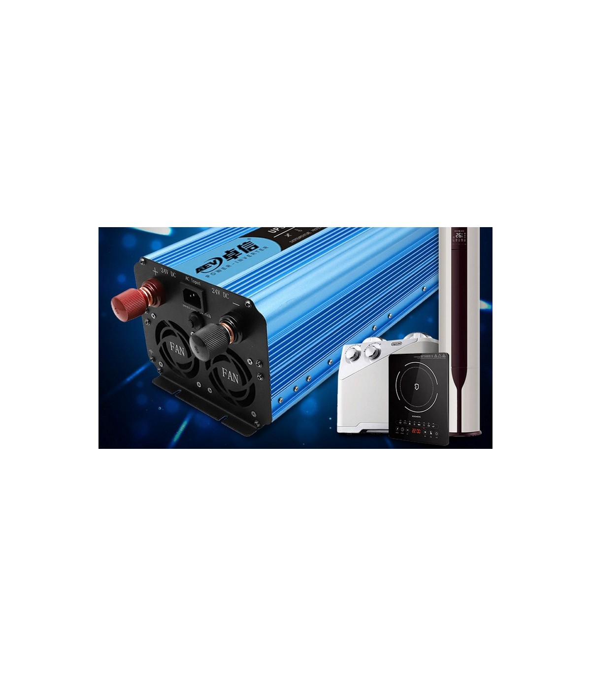 Инвертор преобразователь позволяет подключать электрические устройства, такие как разные аудио-, видео-, бытовая техника, рабочие инструменты и многое другое. Устройство имеет в комплекте кабели питания, которые можно подключать к сети с напряжением 12V, 24V (в зависимости от модели) или 220V (в таком случае работает как UPS). По другую сторону инвертора расположены две розетки, индикаторы режимов работы, кнопка включения устройства, вольтметр выходного напряжения, вольтметр, показывающий уровень заряда батареи и USB-выход. В задней части алюминиевого корпуса расположен также вентилятор для охлаждения преобразователя во время работы и предохранитель. Инвертор работает в спарке со свинцово-кислотными аккумуляторами, имеет встроенное зарядное устройство и защиту от переразряда, что максимально продлевает жизнь батареи.