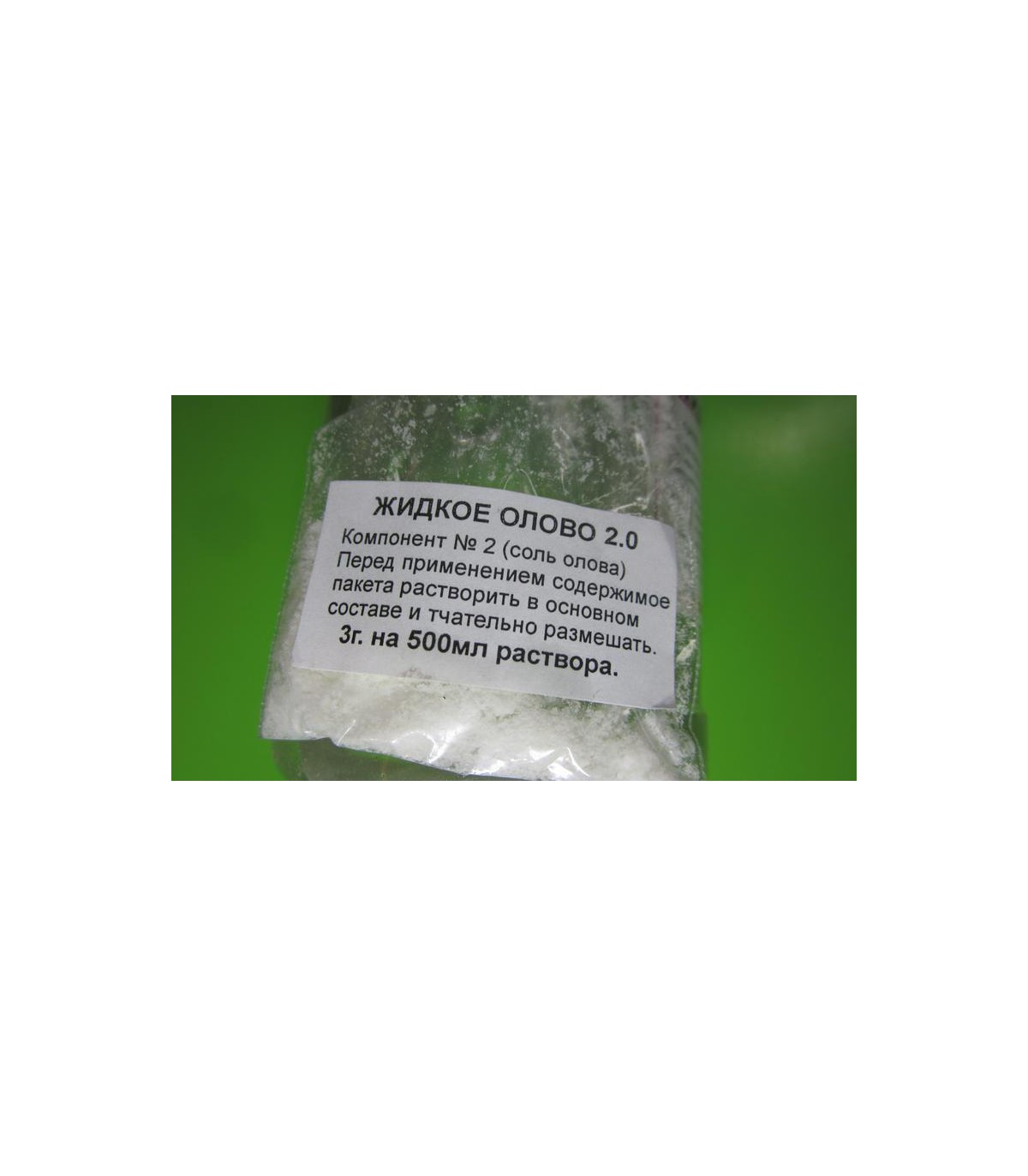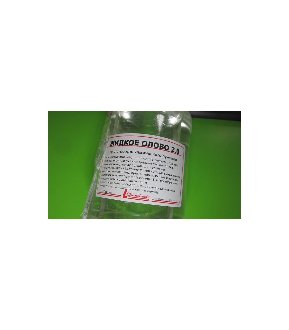 Жидкое олово – раствор для химического лужения печатных плат. Раствор предназначен для покрытия печатных плат и медных деталей оловом.    Способ применения   Плату очистить и обезжирить. Погрузить плату в раствор жидкого олова на 15-30 минут при комнатной температуре. После чего изделие промыть проточной водой. Рекомендуется использовать полиэтиленовую посуду. Согласно надписи на банке, при выдержке 15-30 минут получится слой в 1 мкм. Один литр раствора способен покрыть оловом указанной толщины до 1/2 квадратного метра медной поверхности (50 дм. кв.).  Раствор можно использовать многократно до полного его истощения.   Через пару секунд после погружения в раствор плата полностью “готова”. Процесс протекает тихо без заметного газовыделения (сам раствор запаха не имеет). Процесс не вонючий, пригодный для домашних условий. Покрытие получается ровное, матовое. Блеска нет. Паяется отлично. На банке написано, что не рекомендуется хранить свежий и использованный раствор вместе. Практика показала, что использованный раствор категорически нельзя смешивать со свежим.