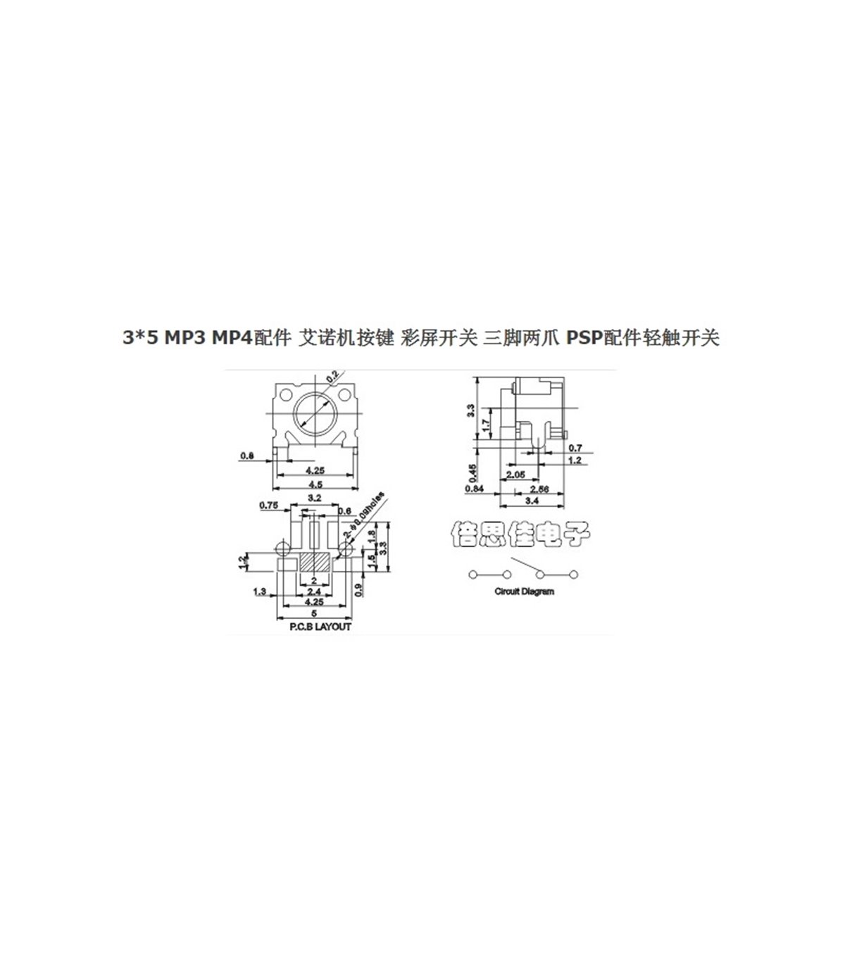 Тактовая кнопка 3*5мм MP3 MP4 3pin под пайку. Размеры указаны на фото.