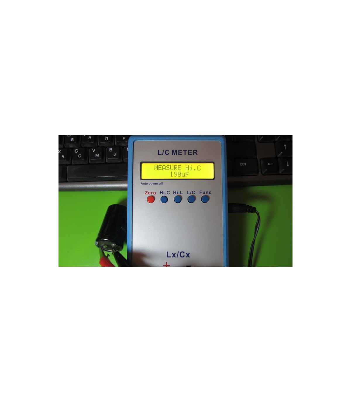 Конденсатор электролитический с напряжением 450V и емкостью 220uF. Размер конденсатора - 35*30мм. Реальная емкость измеряна на LC-метре и показана на рисунке.