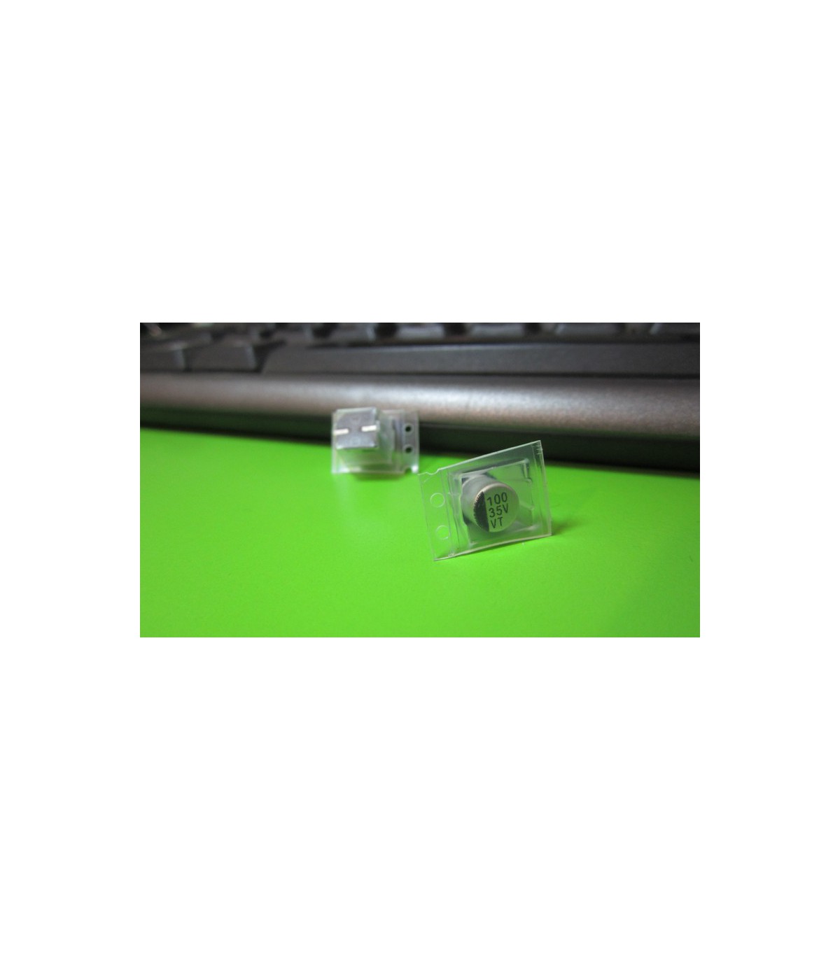 Конденсатор электролитический с напряжением 35V и емкостью 100uF. Размер конденсатора - 6.3*7.7mm.