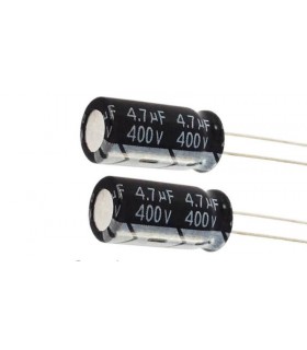 Конденсатор электролитический 4.7mF 400V. Технические характеристики Тип конденсатора: электролитический на основе оксида алюминия. Максимальное рабочее напряжение: 400V Номинальная ёмкость: 4.7mF