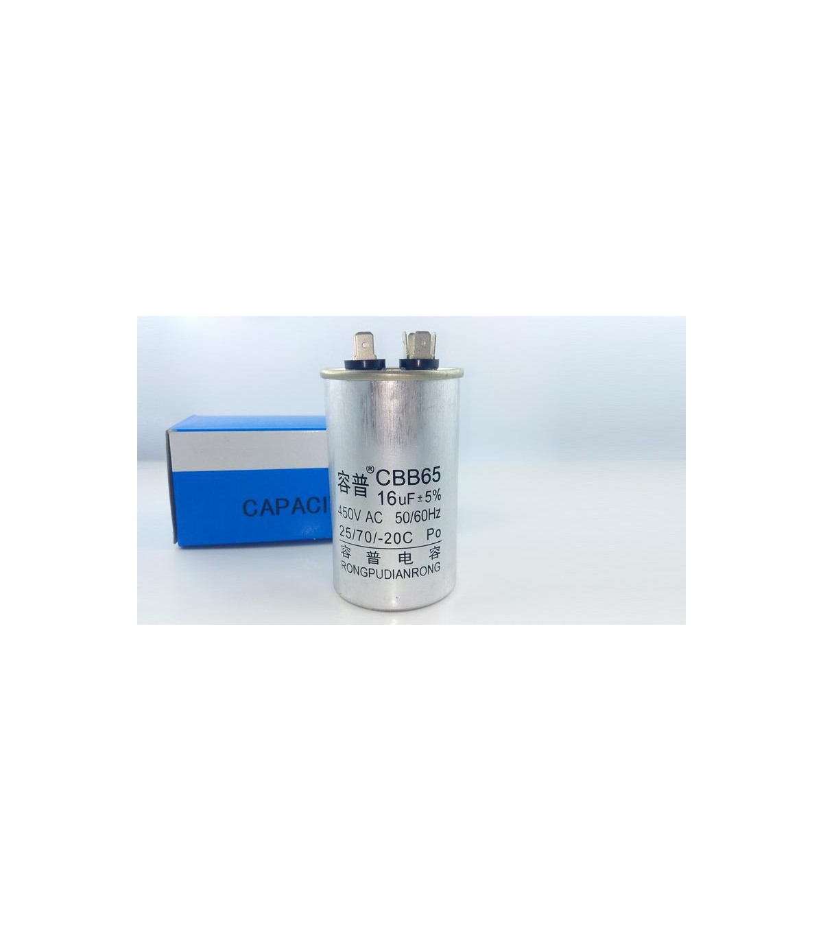 Пусковой конденсатор 16uf 450VAC CBB65. Конденсаторы CBB65 – металлизированные полипропиленовые пленочные конденсаторы постоянной ёмкости в герметизированном цилиндрическом корпусе, накапливают заряд от 4мкФ до 150мкФ при рабочем напряжении переменного тока 450В и 630В. Конденсатор CBB65 может применяться как пусковой или рабочий.
