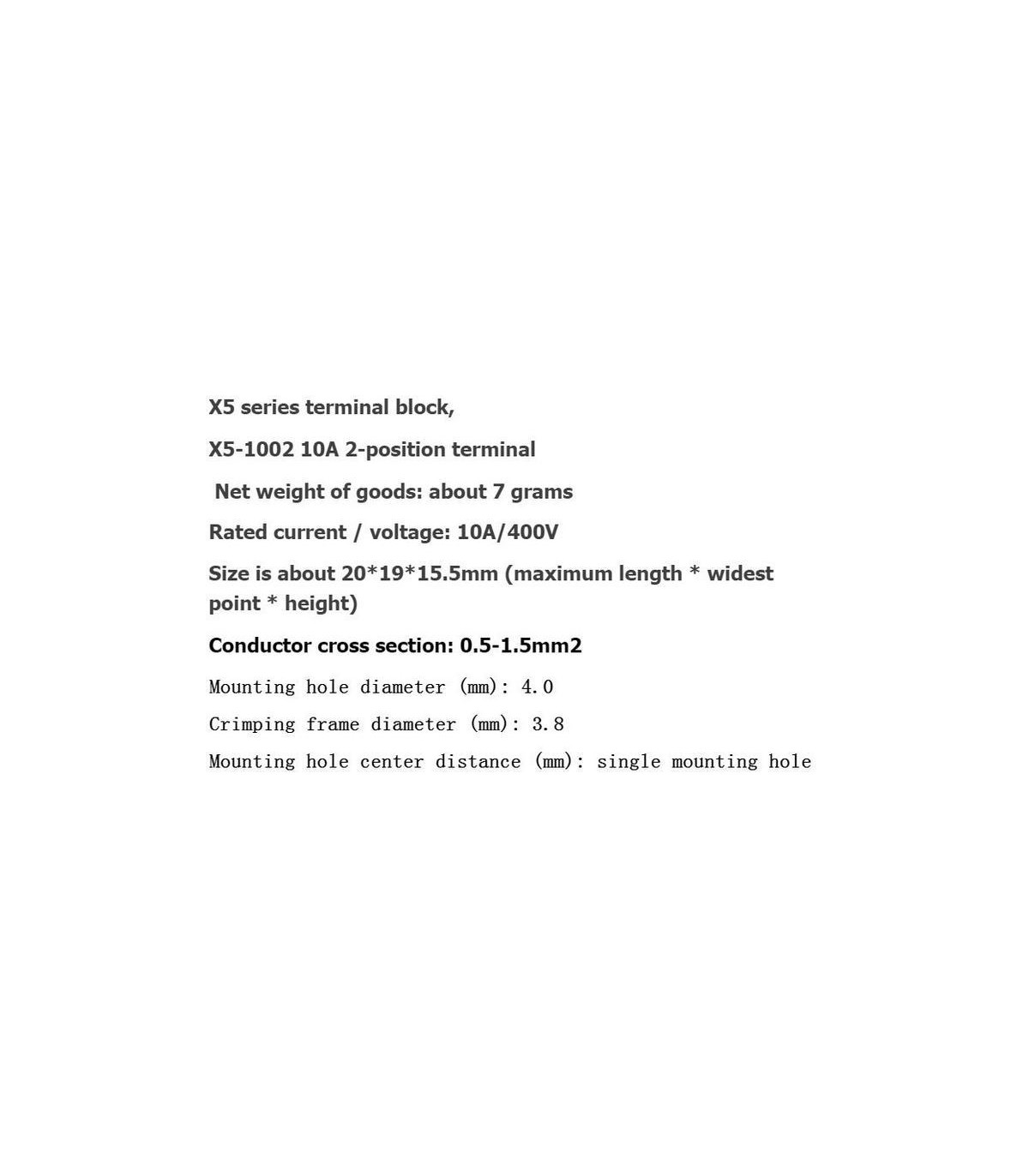 Технические характеристики Ток: 10А Напряжение: 400В Размеры: 20 * 19 * 15.5мм Сечение проводника: 0,5-1,5 мм2 Диаметр отверстия для крепления: 4мм Обжимной диаметр: 3,8мм