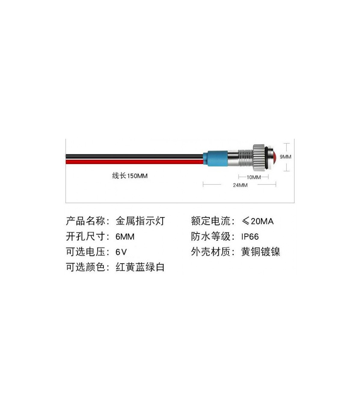 LED светодиод красный DC с питанием 6V и лиаметром монтажной резьбы 6мм. Характеристики и размеры указаны на фото.