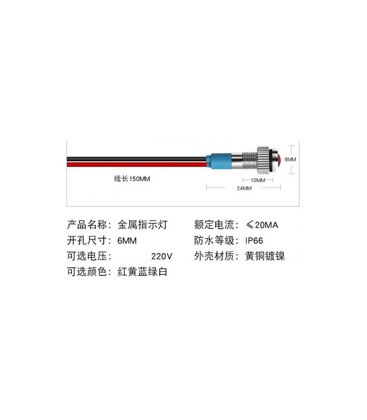 LED светодиод красный с питанием AC 220V и диаметром монтажной резьбы 6мм. Характеристики и размеры указаны на фото.