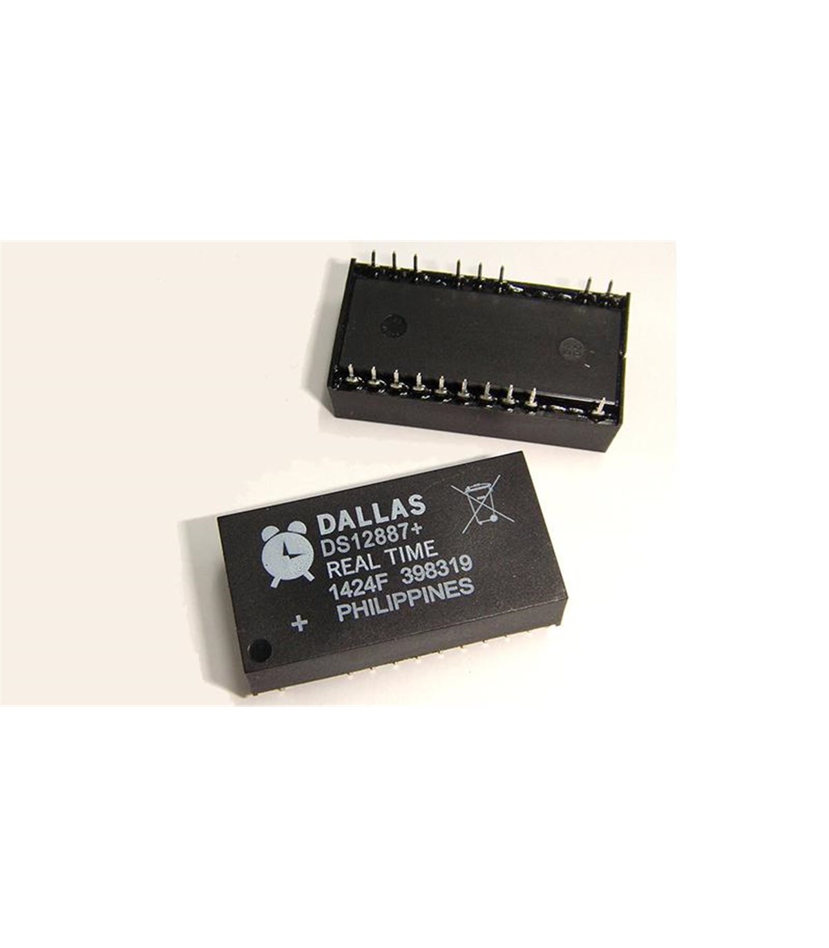 DS12887 - часы реального времени и ОЗУ разработаны для замены DS1287. DS12887 идентичен по конструкции и функциям DS1287, но имеет на 64 байта большее ОЗУ. Доступ к добавленной памяти осуществляется логическим уровнем AD6 в адресной части цикла доступа. Литиевый источник энергии, кварцевый резонатор и схема защиты от записи размещены в двухрядном корпусе с 24 выводами. DS12887 - завершенная подсистема, заменяющая 16 компонентов в типичном применении. Например, энергонезависимые часы, будильник, календарь столетия, программируемое прерывание, генератор прямоугольных импульсов и 114 байт энергонезависимого ОЗУ. Счет времени и сохранение данных в ОЗУ обеспечивается даже при отсутствии основного источника. Встраиваемые в IBM AT компьютеры часы с календарем. Совместимость выводов с MC146818B и DS1287. Сохранение функций энергонезависимости не менее 10 лет с момента отключения питания. Конструктивно законченное изделие, включающее литиевую батарею, кварцевый резонатор и схему поддержки питания. Считает время в секундах, минутах, часах, днях недели, датах месяца, месяцах, годах и учитывает высокосность года до 2100 г. Двоичное и двоично-десятичное представление времени, календаря и настроек будильника. 12–ти или 24–х часовой режим счета часов с индикацией AM (до полудня), PM (после полудня) в 12-ти часовом режиме. Установка времени сбережения дневного света. Возможность выбора временной диаграммы шины Motorola или Intel. Мультиплексированная шина для сокращения выводов. Управляется программным обеспечением через 128 байтное ОЗУ: 14 байт регистров часов и управления, 114 байт ОЗУ общего назначения. Программируемый генератор прямоугольных импульсов. Генерация сигнала прерывания (IRQ). Три раздельно настраиваемых и тестируемых прерывания: будильник, настроенный на время суток, периоды времени от 122 мс до 500мс, конец цикла обновления часов.