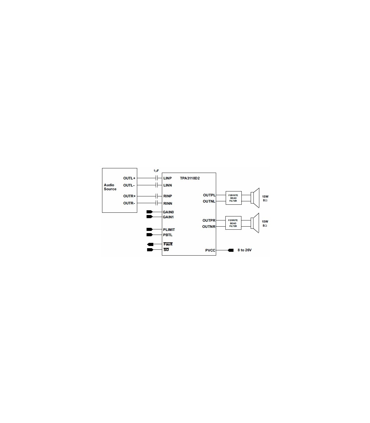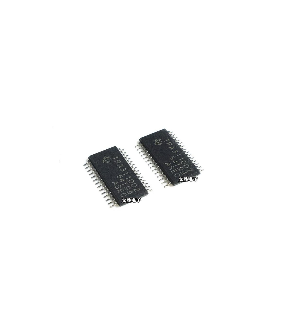TPA3110D2 15 Вт (стерео) / 30 Вт (моно) аудио усилитель мощности класса D с функцией защиты динамика SpeakerGuard. Технические характеристики Класс: D Каналов,шт: 2 POUT,Вт: 30 КПД,%: 90 THD+N,%: 0.06 PSRR (мин.),дБ: 70 SNR,дБ: 102 VCC,В: от 8 до 26 PVCC,В: от 8 до 26 IQ,мА: 20 TA,°C: от -40 до 85 Корпус: TSSOP-28