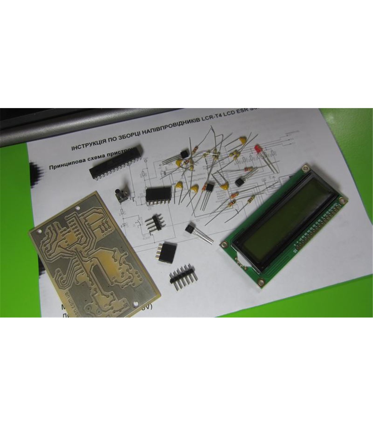 Тестер полупроводников LCR-T4 LCD ESR SCR DIY собери сам. Универсальный тестер радиодеталей, также известный как транзистортестер на микроконтроллере ATMega8 с двохстроковим дисплеем. Прибор позволяет проверять работоспособность радиодеталей, определять Их тип, распиновки и характеристики. Радиодетали, с которыми работает тестер NPN транзисторы - на дисплее 'NPN' PNP транзисторы - на дисплее 'PNP' N-канальные MOSFET - на дисплее 'N-E-MOS' P-канальные MOSFET - на дисплее 'P-E-MOS' N-канальные MOSFET - на дисплее 'N-D-MOS' P-канальные MOSFET - на дисплее 'P-D-MOS' N-канальные JFET - на дисплее 'N-JFET' P-канальные JFET - на дисплее 'P-JFET' Тиристоры - на дисплее 'Tyrystor' Симисторы - на дисплее 'Triak' Диоды - на дисплее 'Diode' Двохкатодни сборки диодов - на дисплее 'Double diode CK' Двохкатодни сборки диодов - на дисплее 'Double diode CA' Два последовательно соединенных диода - на дисплее '2 diode series' Диоды симметричные - на дисплее 'Diode symmetric' Резисторы - диапазон от 1 Ом до 10 МОм [Ом, kОм] Конденсаторы - диапазон от 0,2nF к 5000uF [nF, uF]