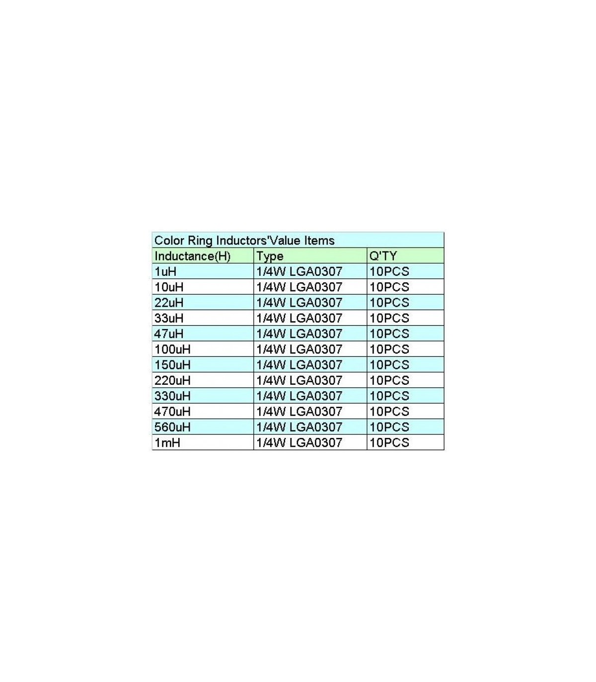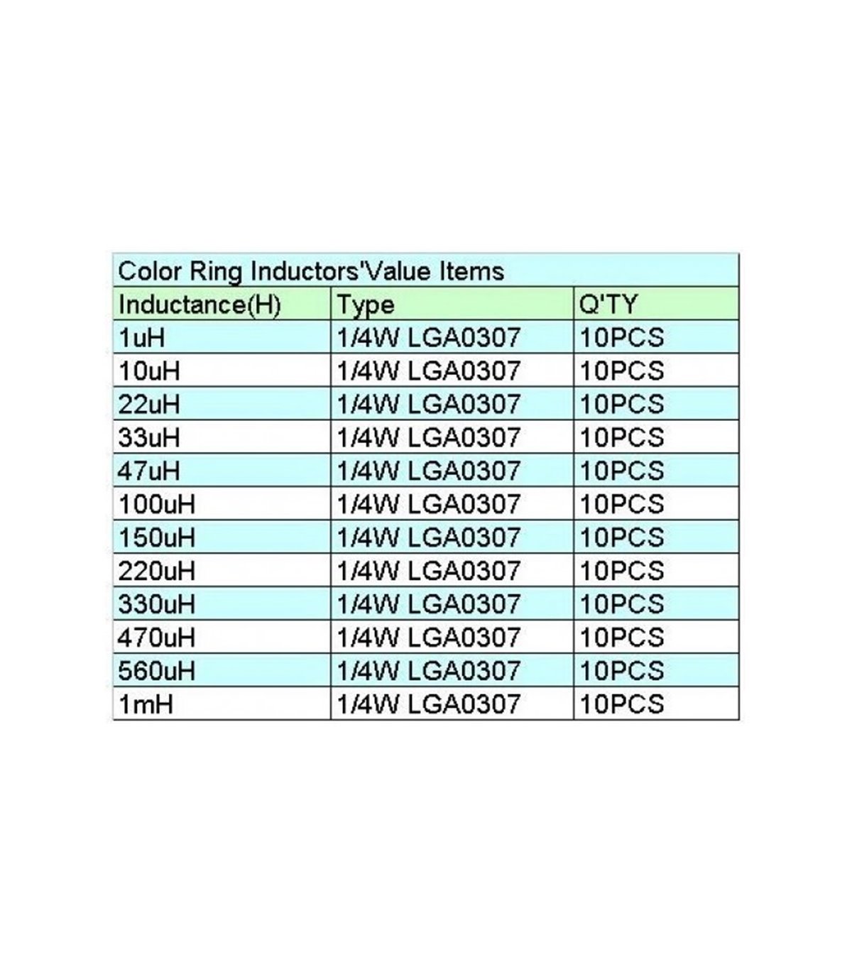 Комплект набор индукторов 0.25W 1UH-1MH 120 штук. 12 номиналов по 10 штук. Номиналы 1UH, 10UH, 22UH, 33UH, 47UH, 100UH, 150UH, 220UH, 330UH, 470UH, 560UH, 1MH.