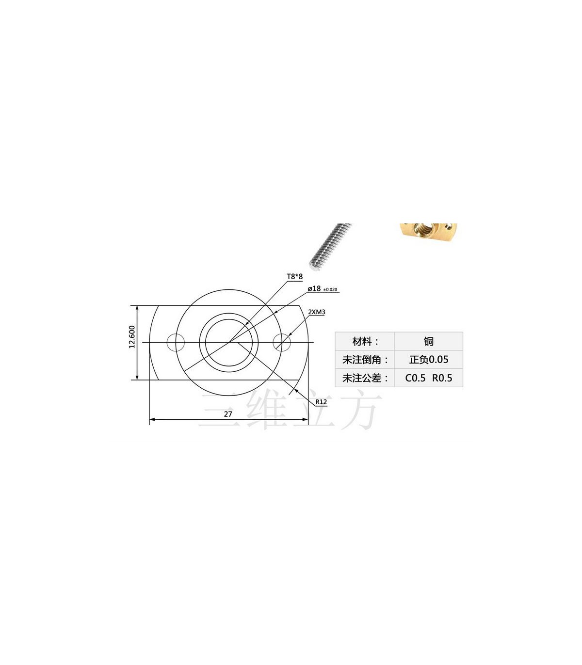 Гайка на четырехзаходный винт T8 шаг 3мм. В станкостроении и робототехнике трапецеидальный винт-гайка Т8 используются там, где существуют небольшие скорости вращения при преобразовании поступательного движения во вращательное движение. Данные узел работает на принципах скольжения и трения, поэтому трапецеидальный винт требователен к уходу за собой и чувствителен к высоким скоростям.