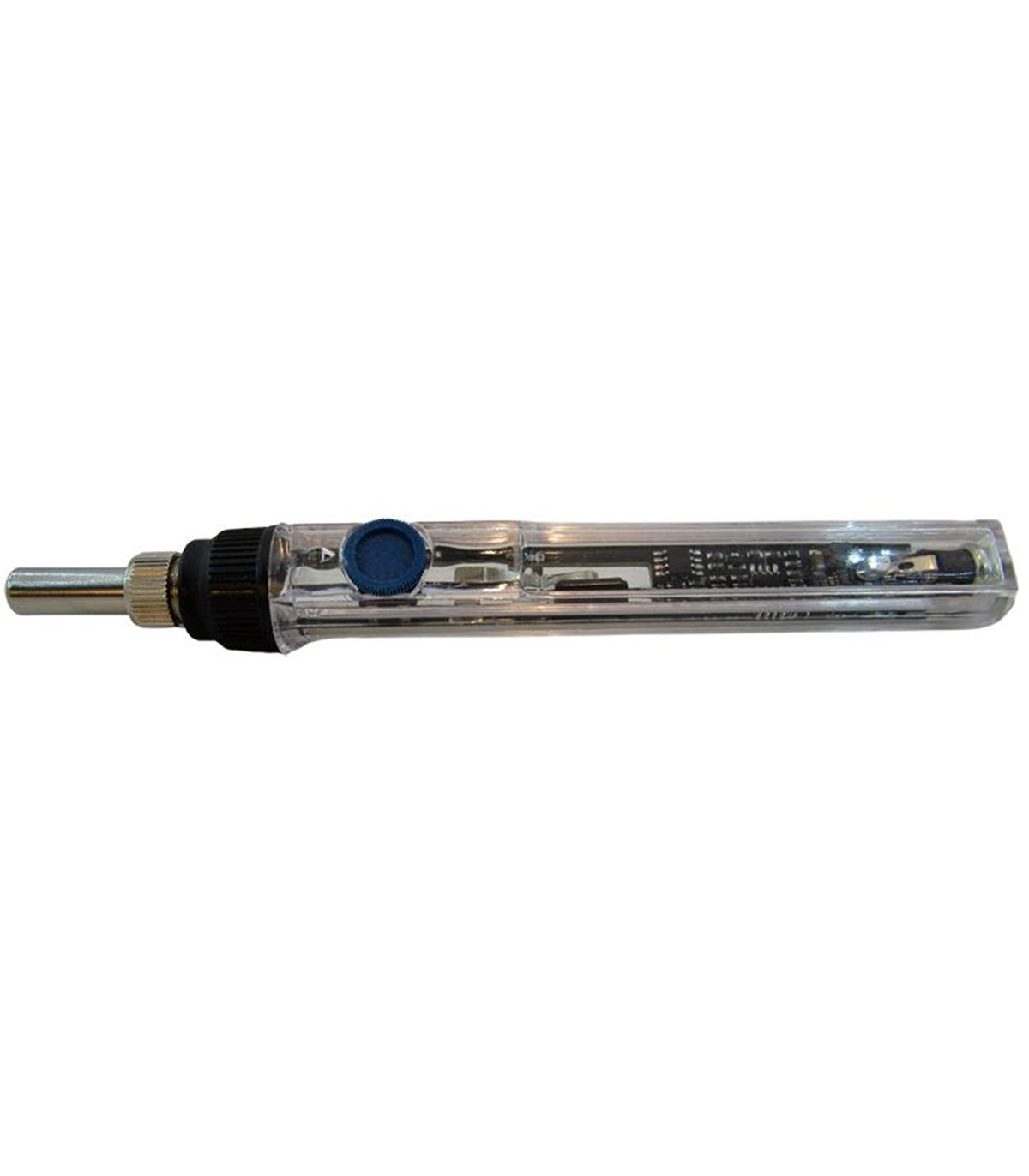 Паяльник контактного типа мощностью 75 Вт с регулировкой температуры, но без индикации температуры. Применяется при соединении деталей электронных или электротехнических изделий с помощью мягкого припоя. Полностью безопасен и экономный, работает через блок питания. Имеет датчик вибрации, то есть когда берете его в руки, - паяльник начинает разогреватся, если стоит на подставке, то в ждущем режиме работает. Работает инструмент от блока питания DC5.5-2.1мм на 12-24V. Корпус паяльника выполнен в прозрачном корпусе благодаря чему можно рассмотреть электронные элементы паяльника. Индикатор и регулятор температуры встроены в прозрачный корпус паяльника. Регулятор может контролировать и менять температуру паяльника в диапазоне 200-450C.